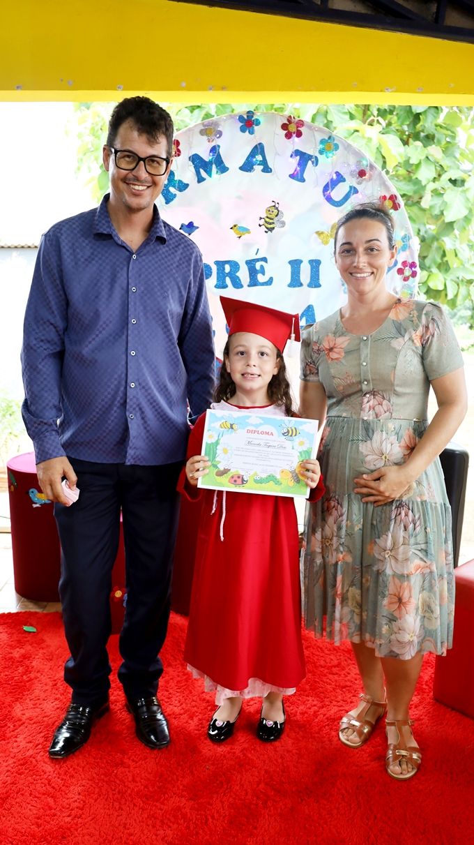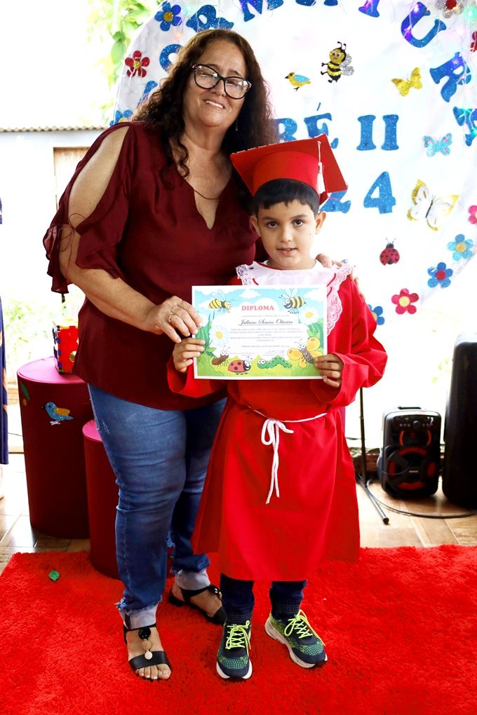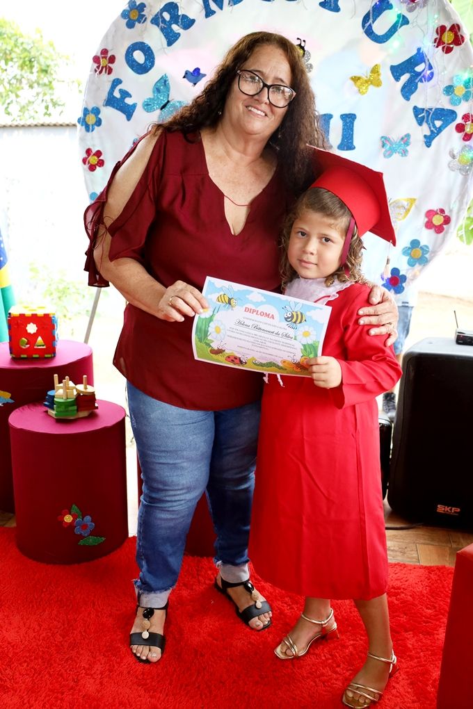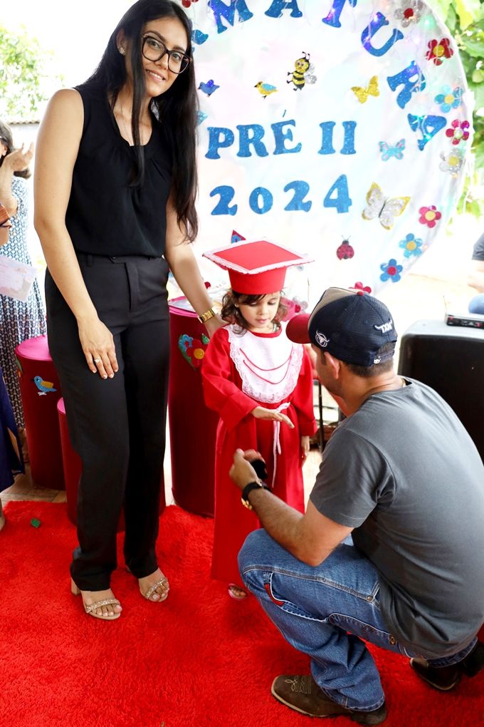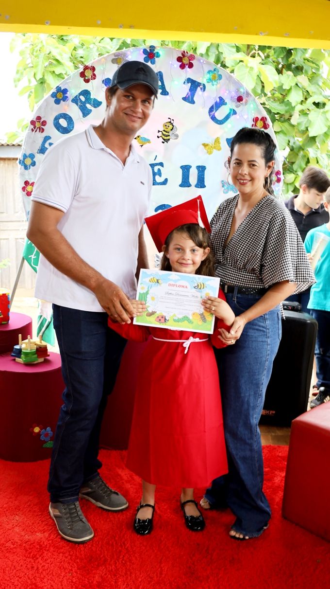O evento foi marcado com momentos especiais, como o juramento da turma, realizado pela aluna Manoela, a entrega dos certificados e lembrancinhas encerrando com os pais presenteando seus filhos com um anel.