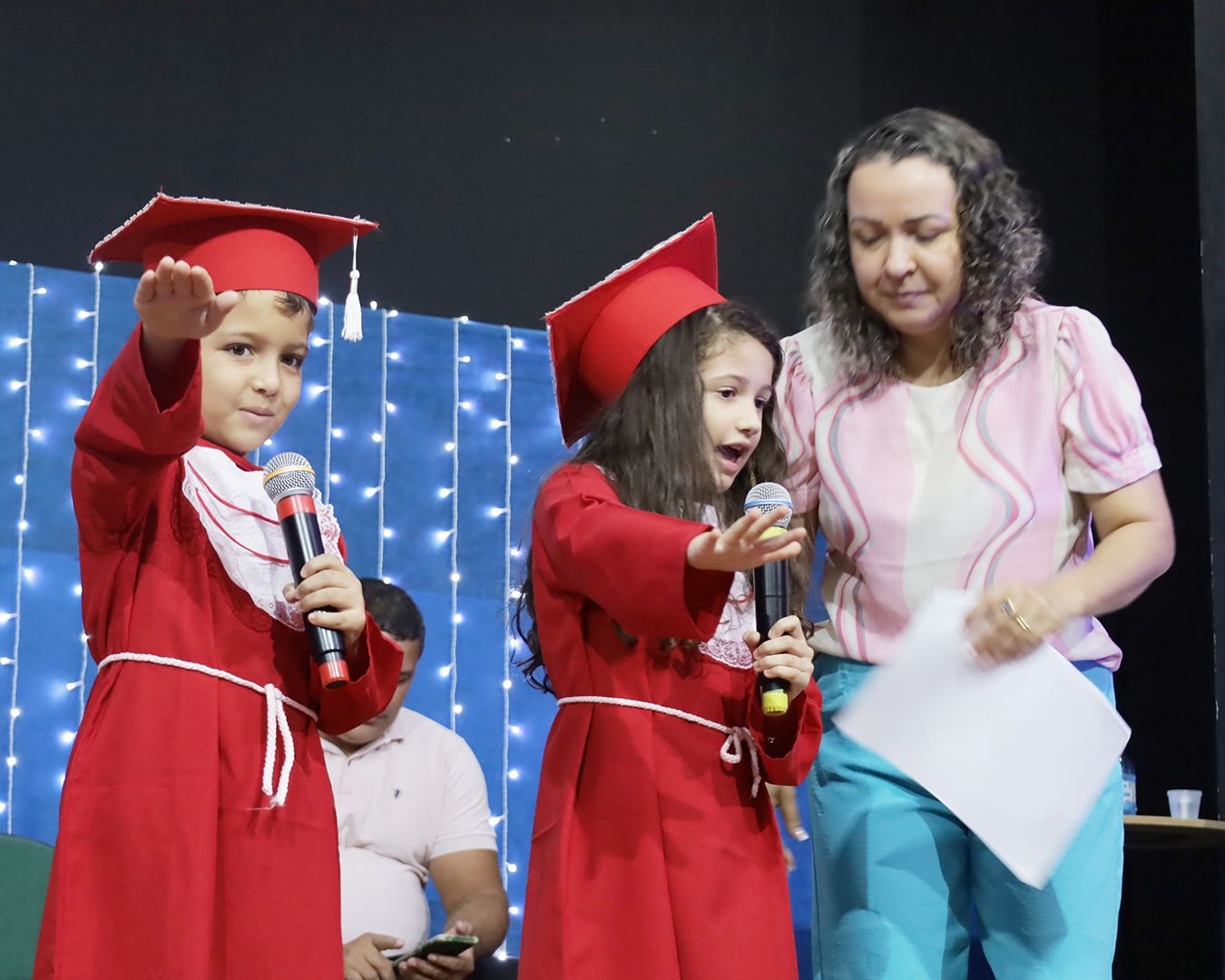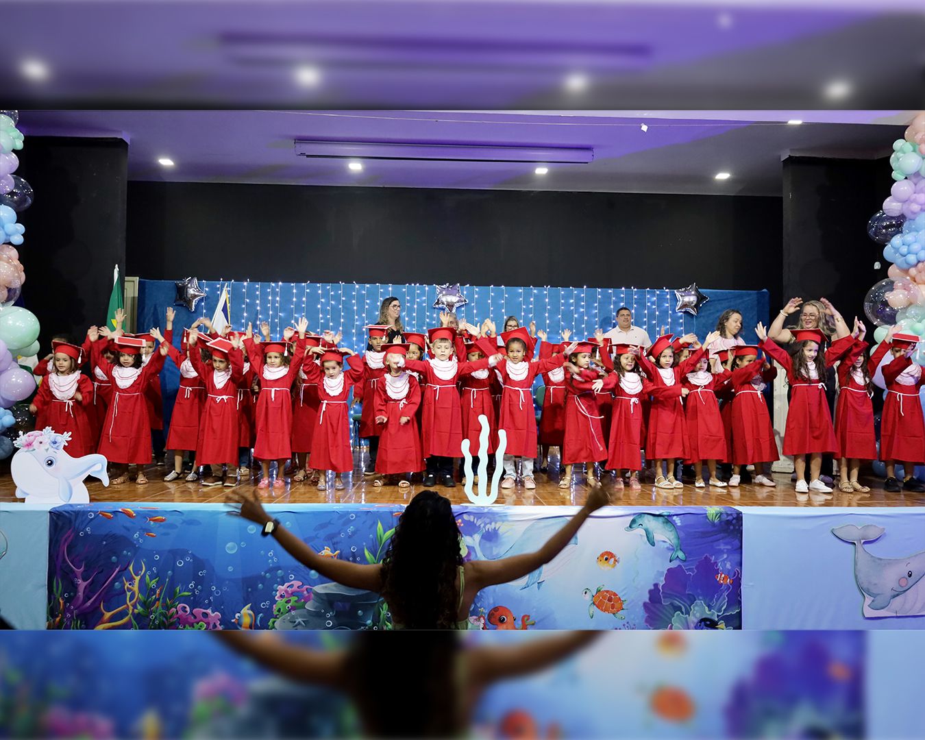 O evento foi repleto de momentos especiais, com apresentações encantadoras das turmas. O juramento foi conduzido pelo aluno Alan Gabriel Lopes Quintana do Pré II – D da professora Luciane Zacarias dos Reis, que guiou seus colegas graduandos na recitação do juramento, formando um grande coro com 107 vozes.