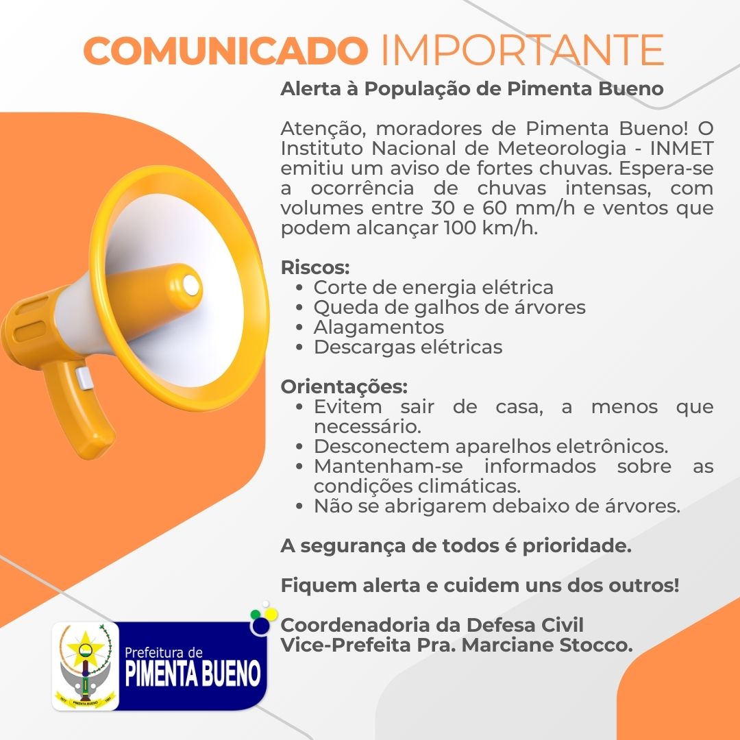 Atenção, moradores de Pimenta Bueno! O Instituto Nacional de Meteorologia - INMET emitiu um aviso de fortes chuvas. Espera-se a ocorrência de chuvas intensas, com volumes entre 30 e 60 mm/h e ventos que podem alcançar 100 km/h.