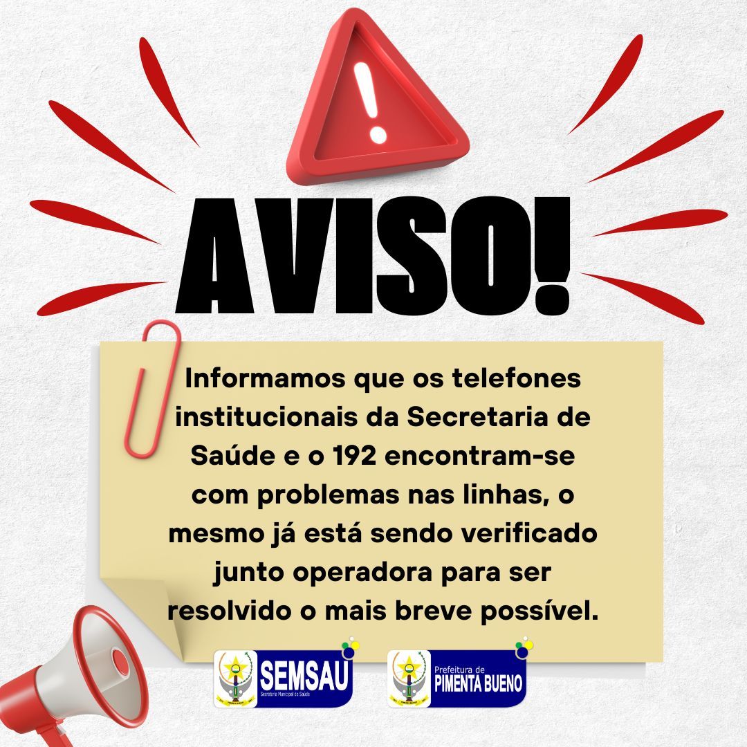 Informamos que os telefones institucionais da Secretaria de Saúde e o 192 encontram-se com problemas nas linhas, o mesmo já está sendo verificado pela operadora para que seja resolvido o mais breve possível.