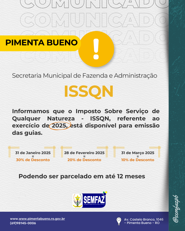 ISSQN 2025 com até 30% de desconto. Já está disponível para emissão das guias. Confira: