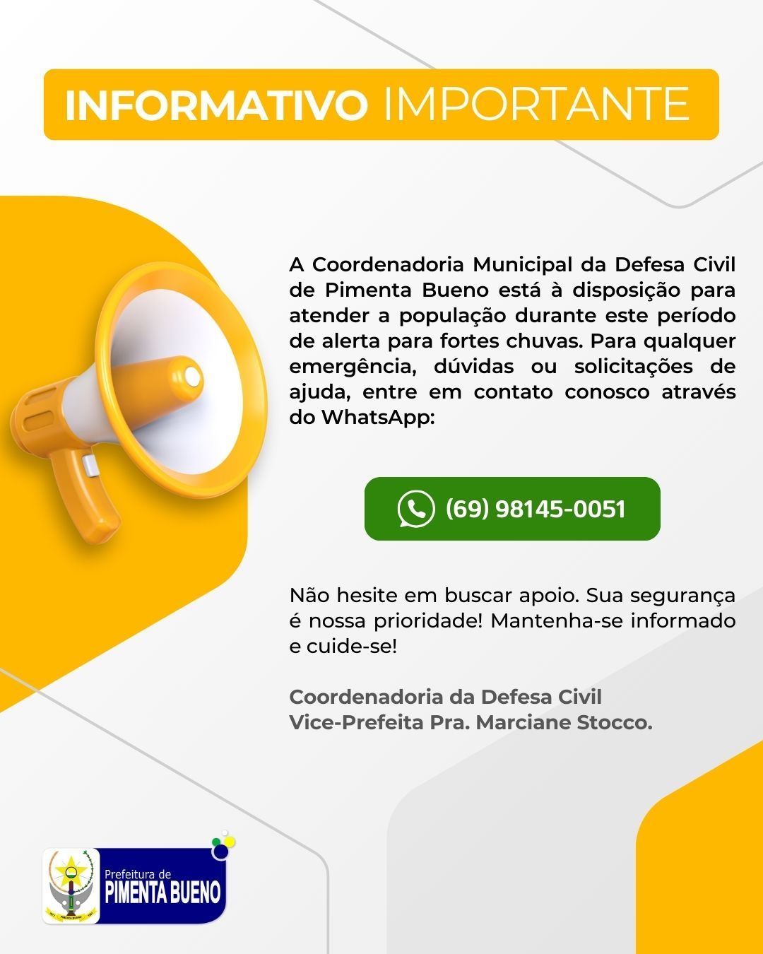A Coordenadoria Municipal da Defesa Civil de Pimenta Bueno está à disposição para atender a população durante este período de alerta para fortes chuvas. Para qualquer emergência, dúvidas ou solicitações de ajuda, entre em contato conosco através do WhatsApp: