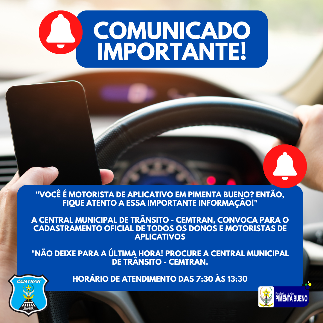 A Central Municipal de Trânsito - CEMTRAN, convoca para o cadastramento oficial de todos os donos e motoristas de aplicativos
