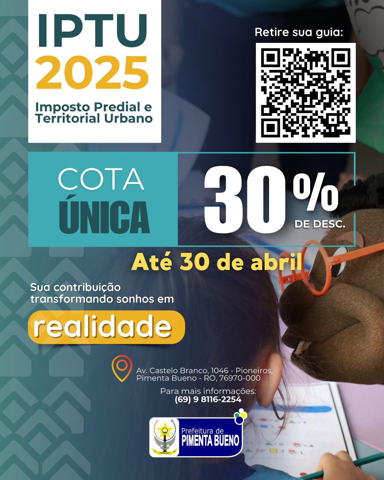 (69) 98116-2254.Os vencimentos são:I - Cota Única com 30% (trinta por cento) de desconto para o valor correspondente ao IPTU, para pagamento até 30/04/2025;Informamos ainda que NÃO se aplicam os descontos previstos na Taxa de Serviço de Manejo de Resíduos Residenciais e Não Residenciais - TSMR (taxa de coleta de lixo) e Contribuição para Custeio dos Serviços de Iluminação Pública - COSIP