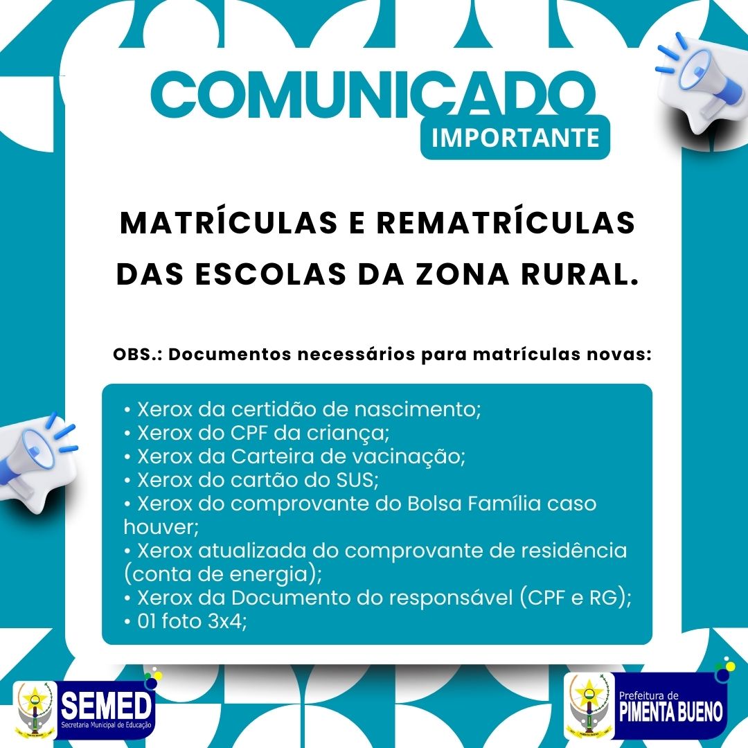 Senhores Pais ou Responsável legais, as rematrículas e matrículas novas da Escola M.E.I.E.F. Urucumacuã acontecerão nesta terça-feira, dia 04/02/2025, na própria unidade escolar, no período das 13h às 15h.