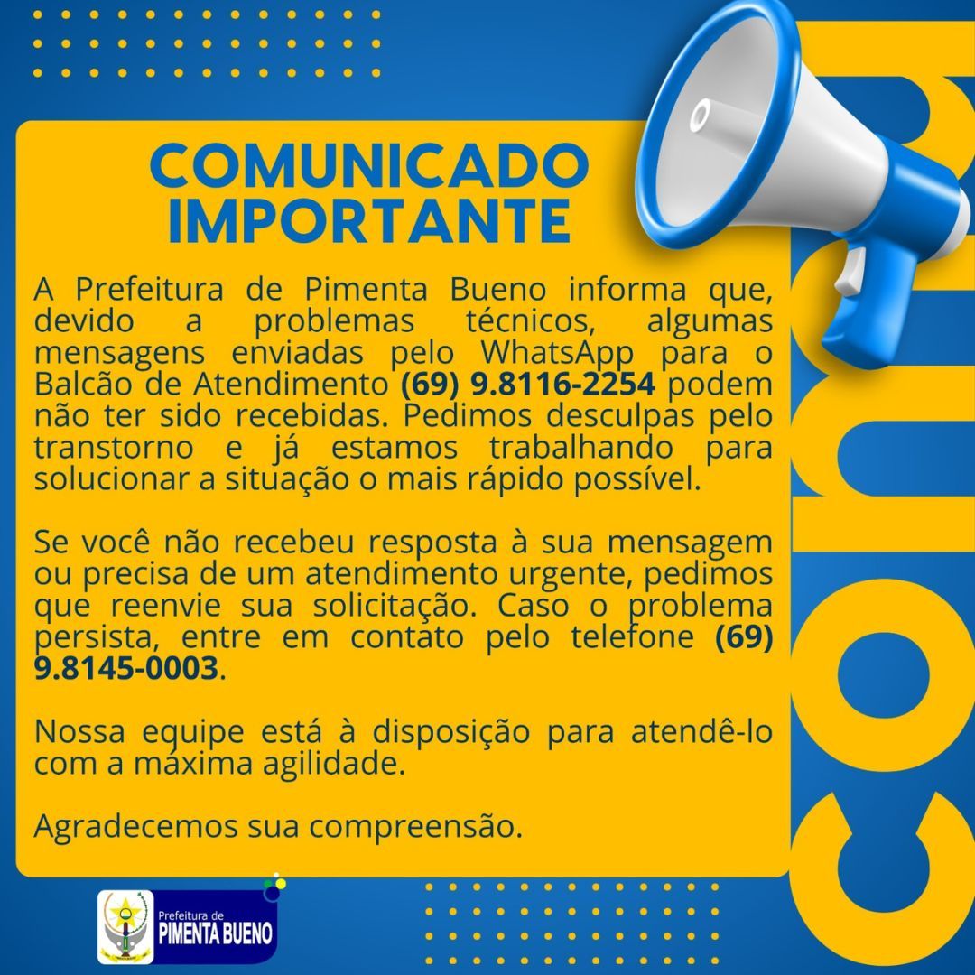 A Prefeitura de Pimenta Bueno informa que, devido a problemas técnicos, algumas mensagens enviadas pelo WhatsApp para o Balcão de Atendimento (69) 9.8116-2254 podem não ter sido recebidas. Pedimos desculpas pelo transtorno e já estamos trabalhando para solucionar a situação o mais rápido possível.