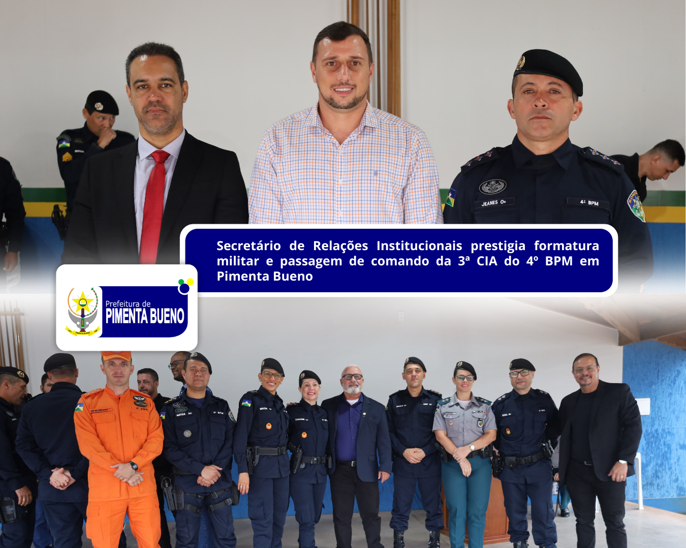 O Secretário de Relações Institucionais, Cássio Ribeiro, representou a Prefeita Prof. Marcilene Rodrigues na cerimônia de formatura militar e passagem de comando da 3ª Companhia da Polícia Militar do 4º Batalhão de Polícia Militar (BPM), em Pimenta Bueno. O evento, realizado nesta sexta-feira, reuniu autoridades civis e militares, além de familiares e membros da comunidade, em um momento solene de reconhecimento ao trabalho desempenhado pela corporação.