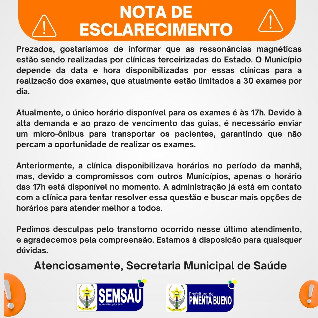 Gostaríamos de informar que as ressonâncias magnéticas estão sendo realizadas por clínicas terceirizadas do Estado. O Município depende da data e hora disponibilizadas por essas clínicas para a realização dos exames, que atualmente estão limitados a 30 exames por dia.