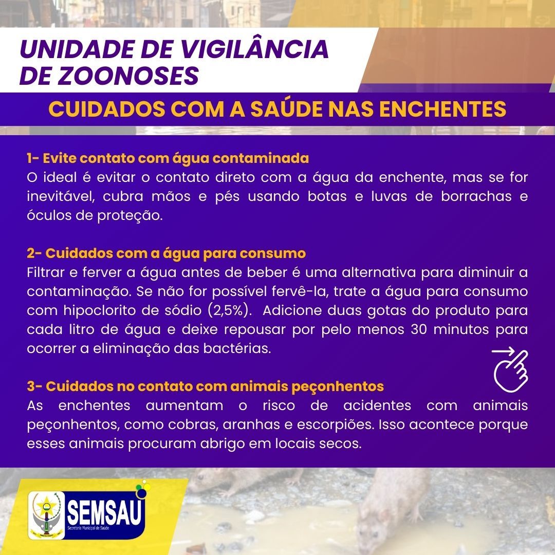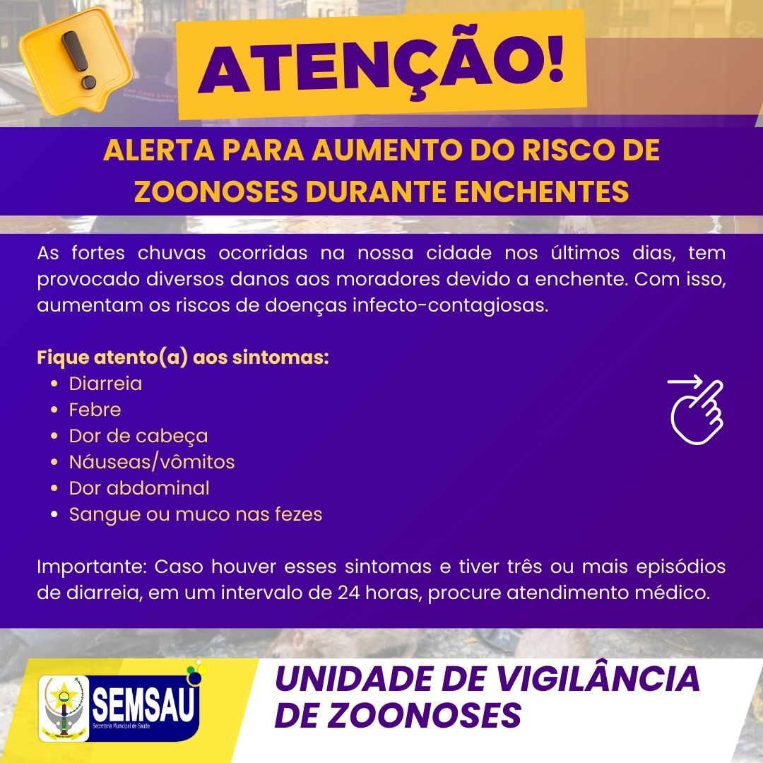 As fortes chuvas ocorridas na nossa cidade nos últimos dias, tem provocado diversos danos aos moradores devido à enchente. Com isso, aumentam os riscos de doenças infecto-contagiosas.