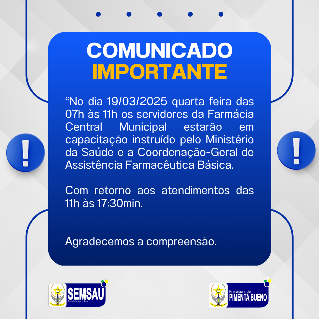 No dia 19/03/2025 quarta feira das 07h às 11h os servidores da Farmácia Central Municipal estarão em capacitação instruído pelo Ministério da Saúde e a Coordenação-Geral de Assistência Farmacêutica Básica.