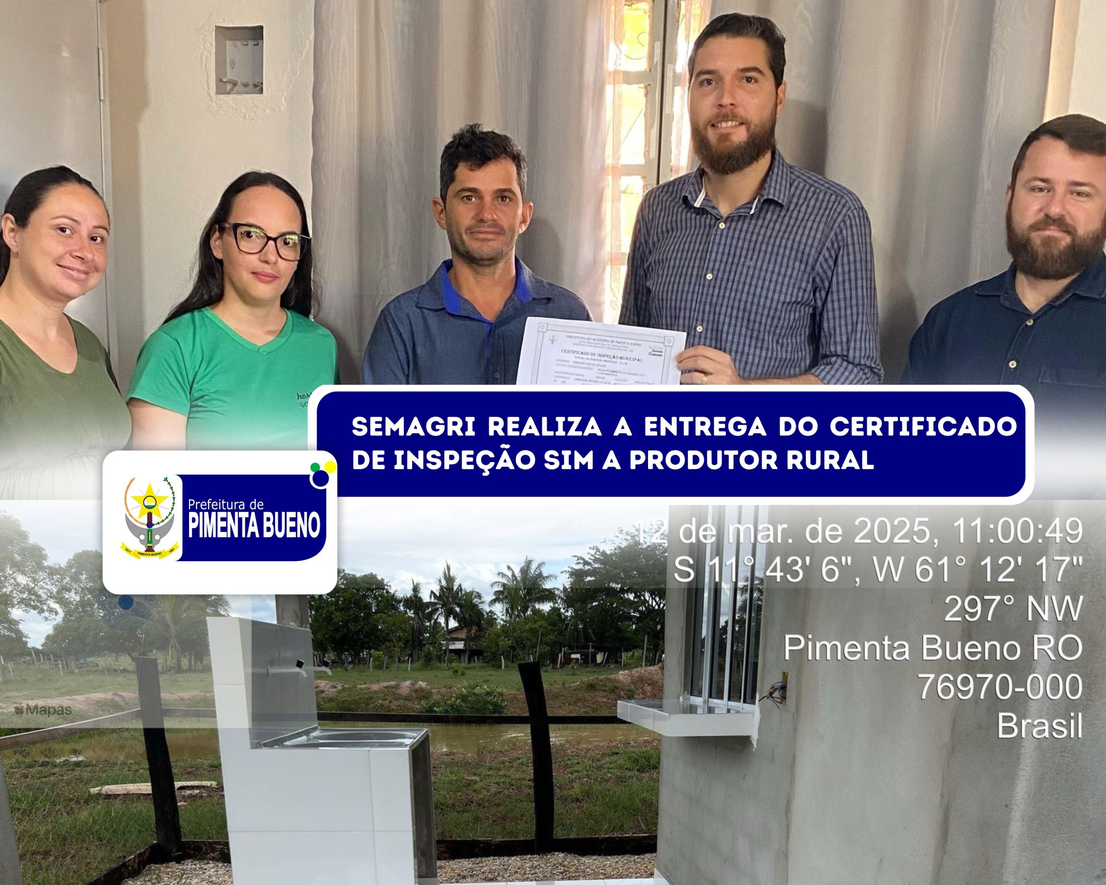 Nesta segunda feira, 17/03/2025, a Secretaria Municipal de Agricultura SEMAGRI, realizou a entrega do CERTIFICADO DE INSPEÇÃO SIM ao produtor Gedeon Vaz de Souza, proprietário da Chácara Menina Bonita setor Marta Regina, documento esse que atesta a segurança e a qualidade higiênica e sanitária dos produtos comercializados.
