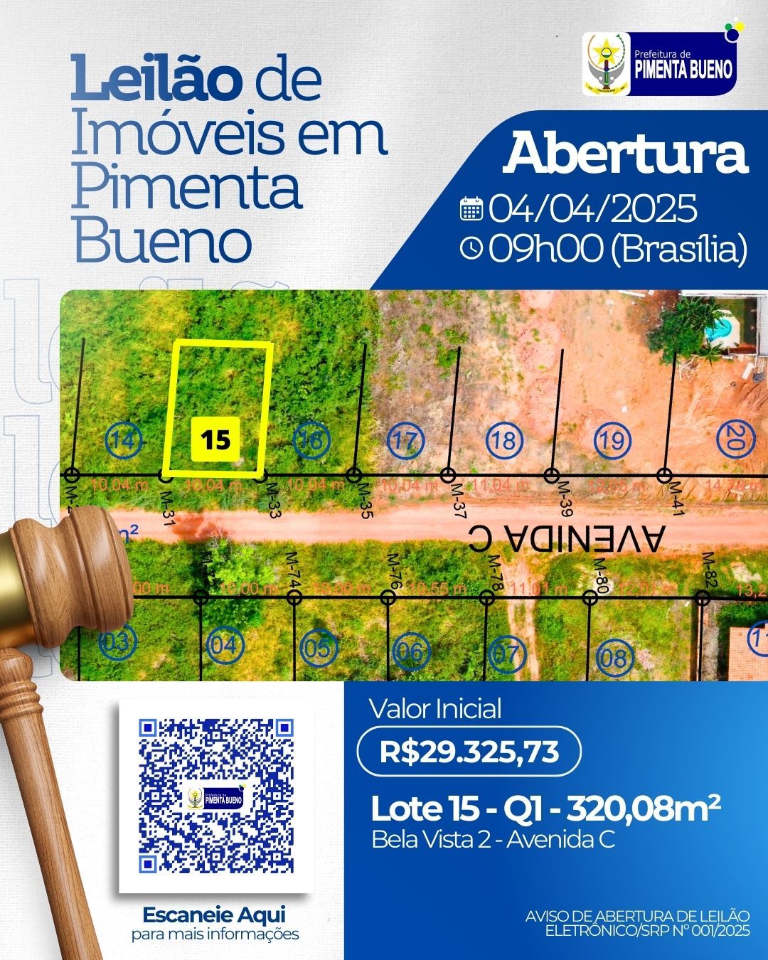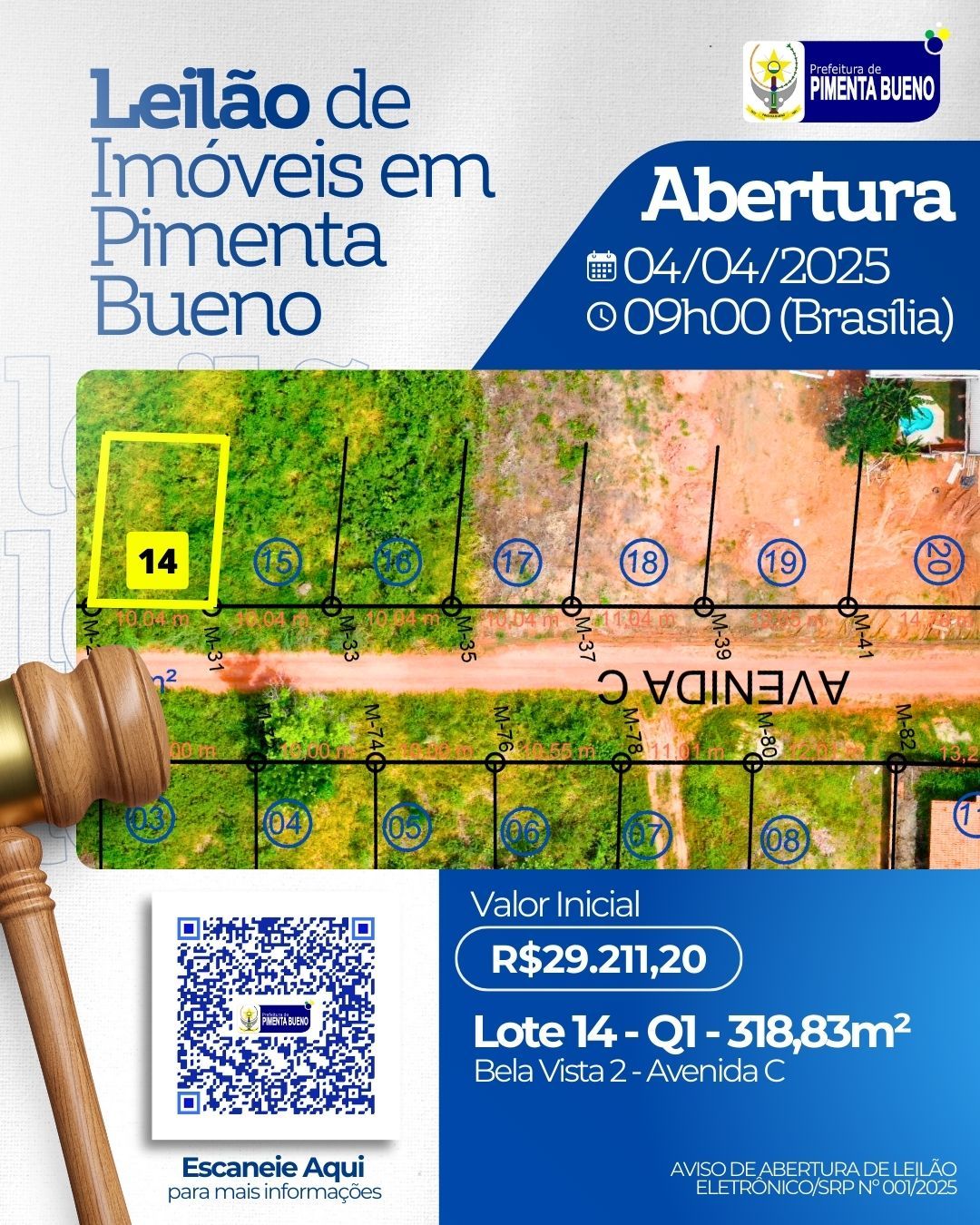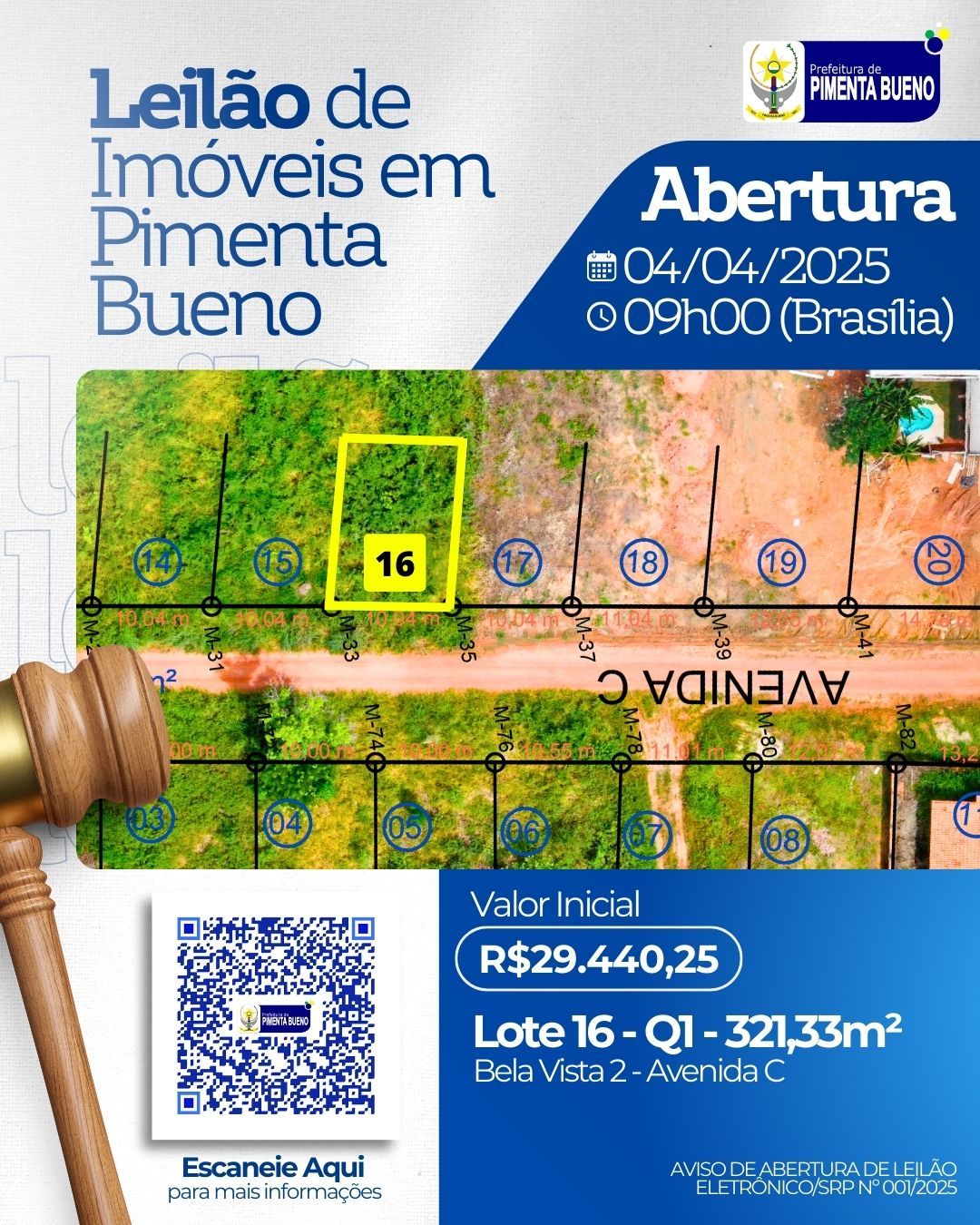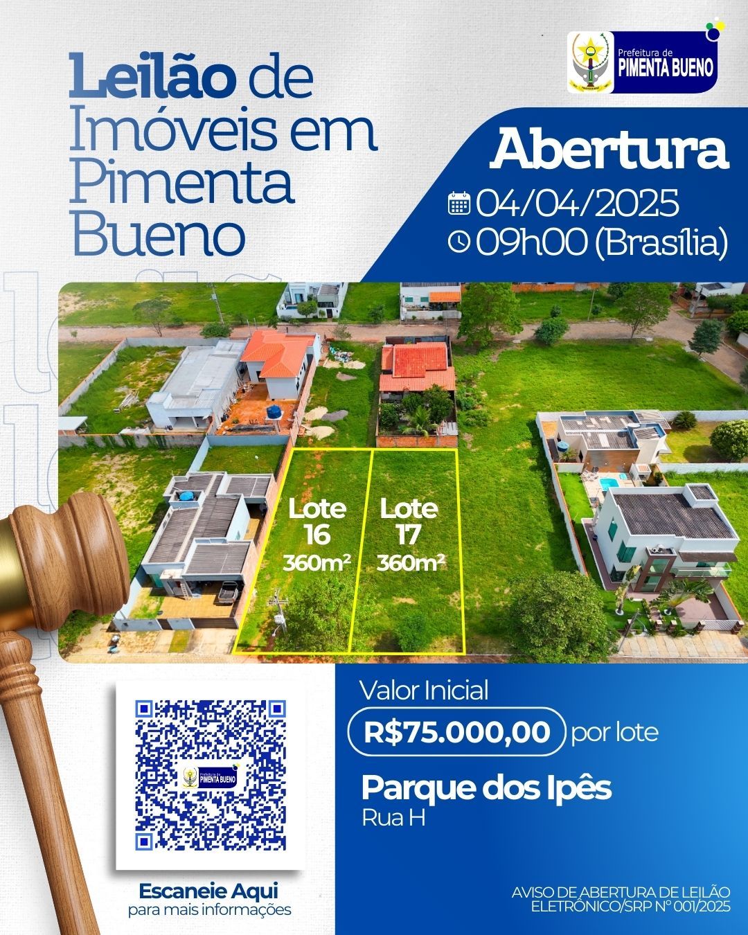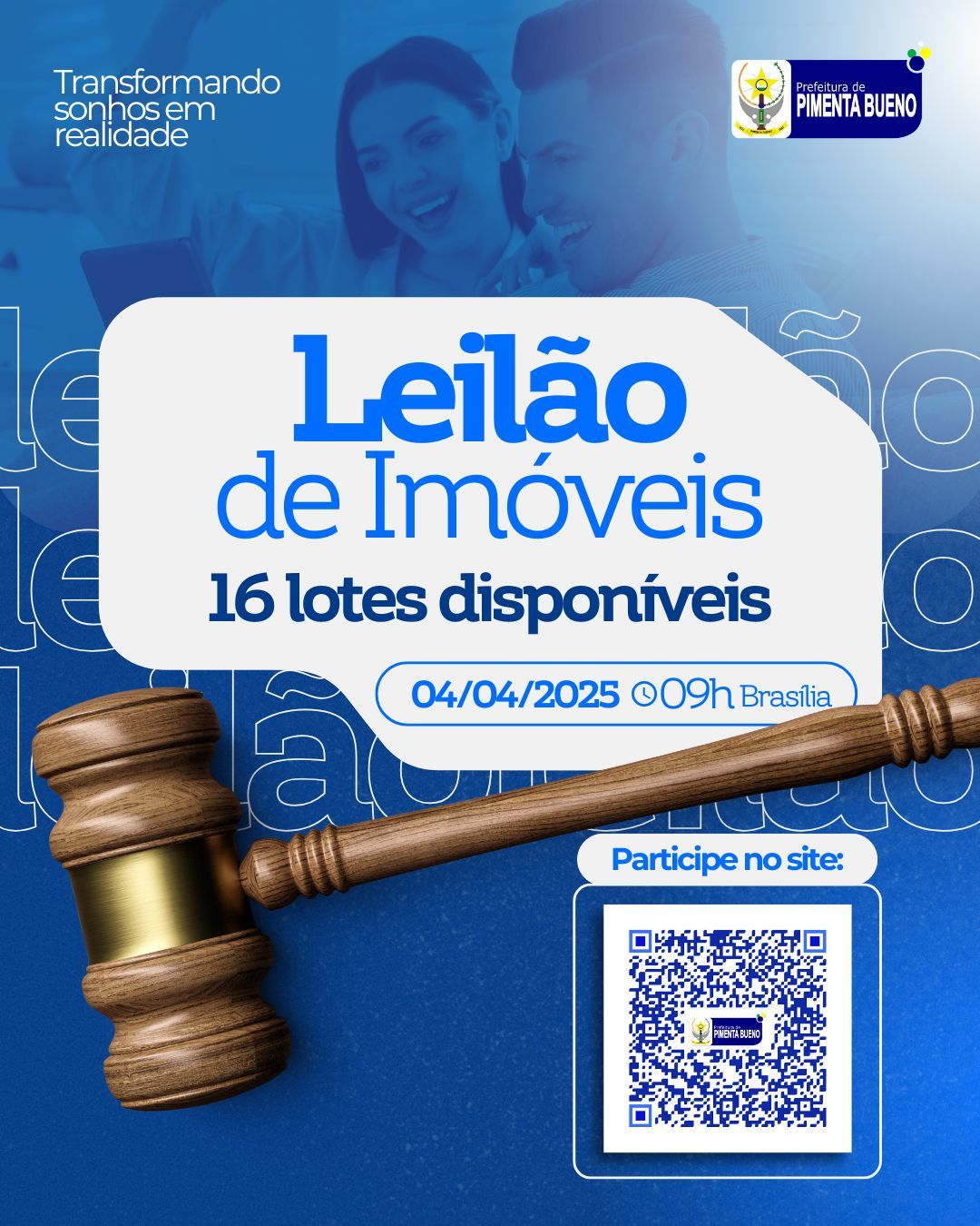 A Prefeitura de Pimenta Bueno torna pública a abertura do Leilão Eletrônico para a alienação de 16 imóveis do patrimônio público municipal. Essa é uma grande oportunidade para quem deseja investir!