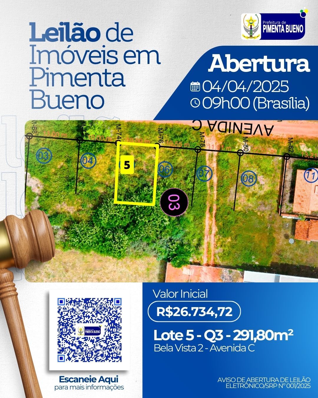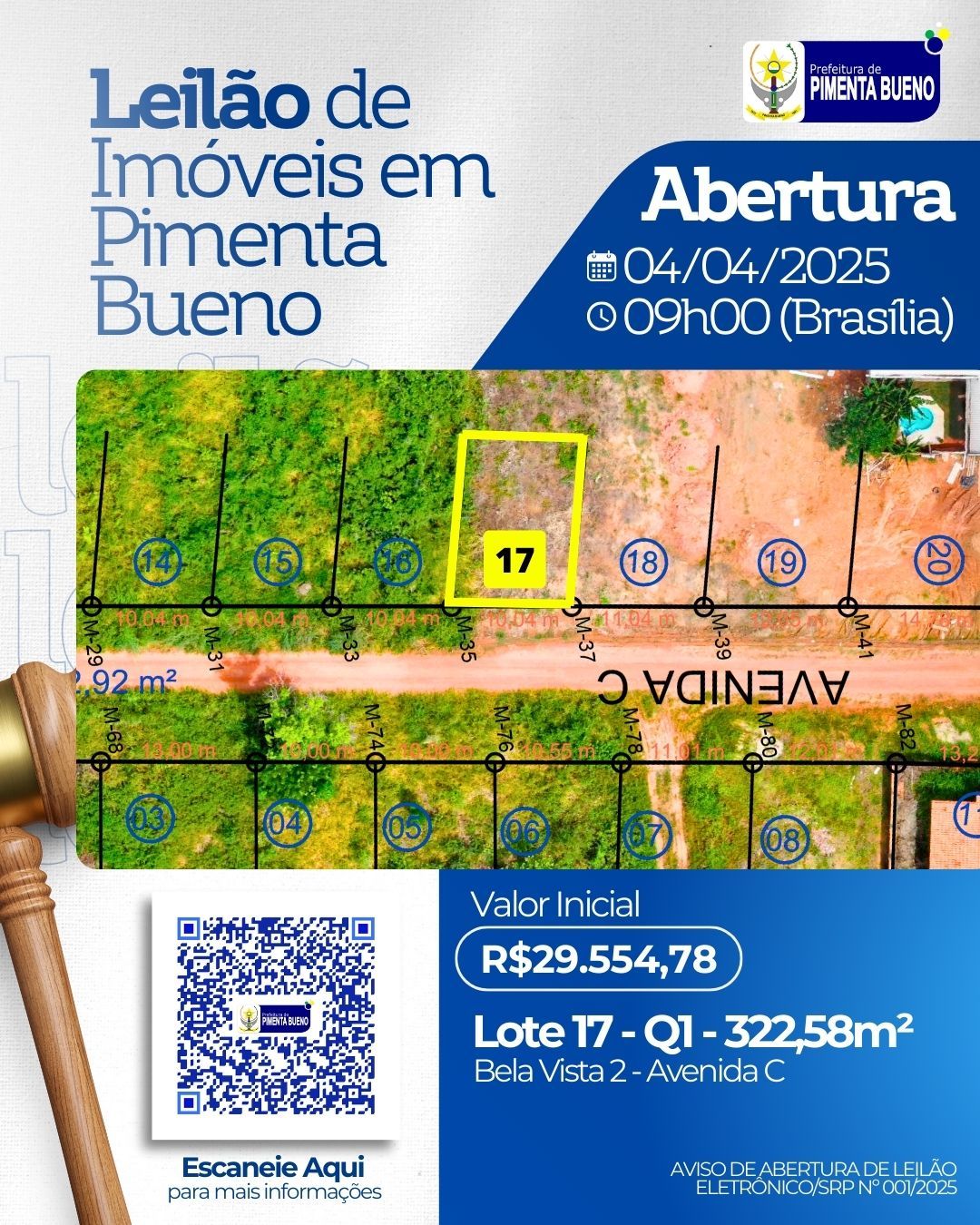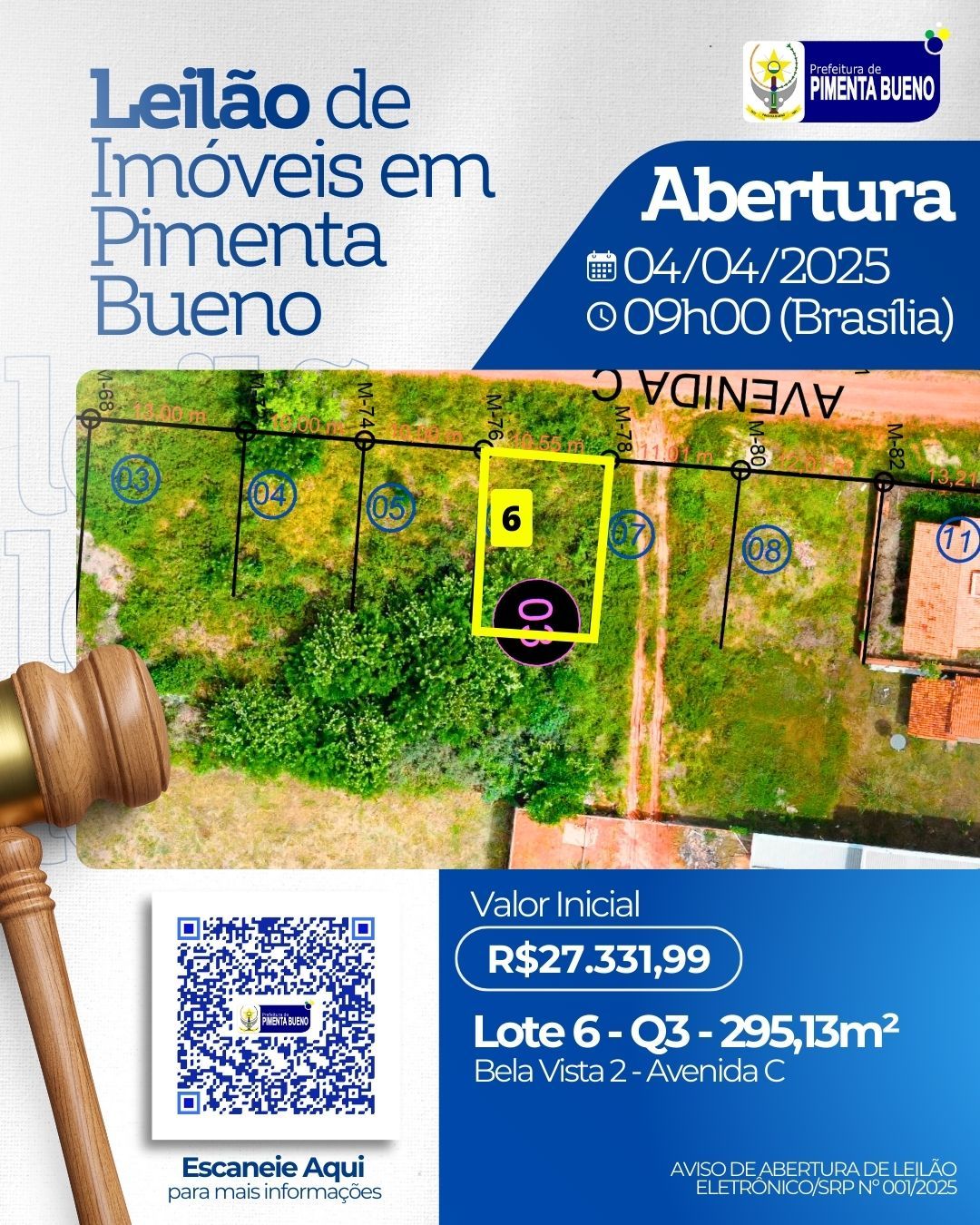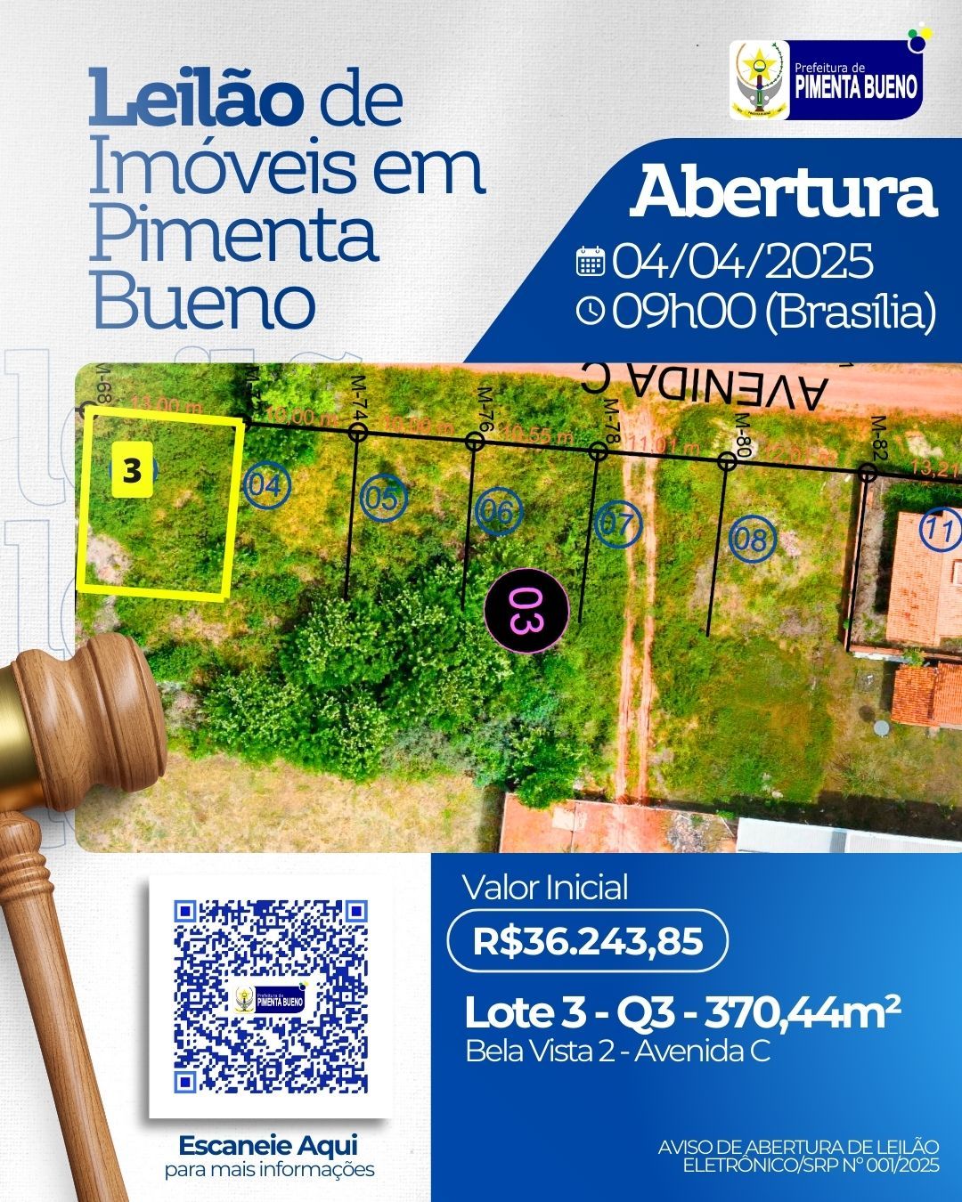 A Prefeitura de Pimenta Bueno torna pública a abertura do Leilão Eletrônico para a alienação de 16 imóveis do patrimônio público municipal. Essa é uma grande oportunidade para quem deseja investir!