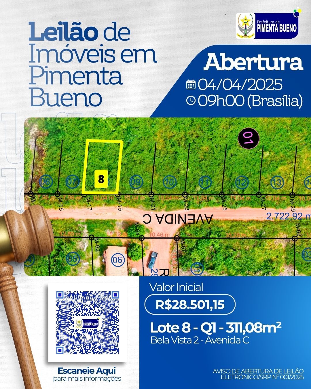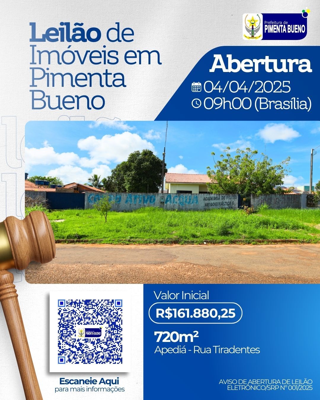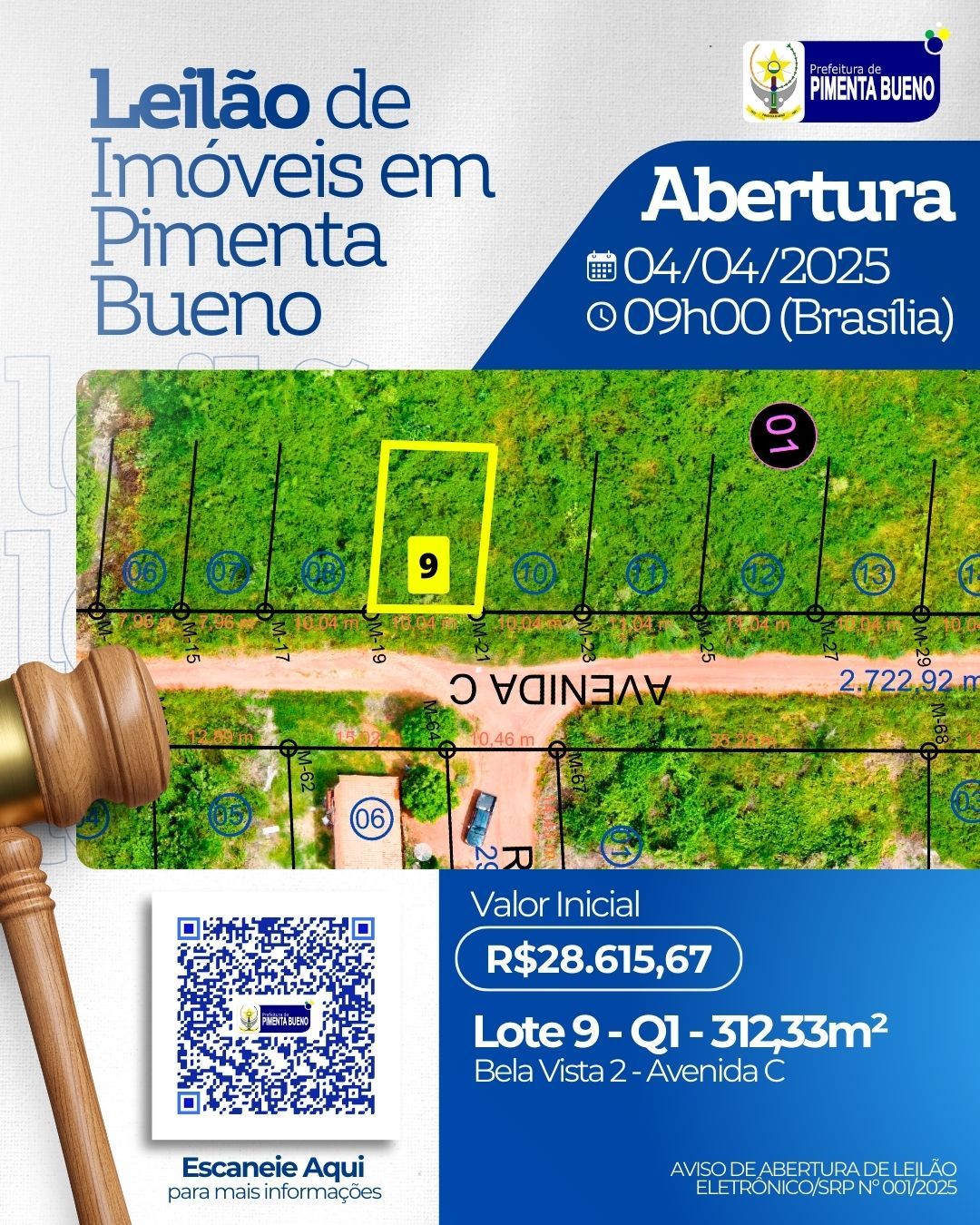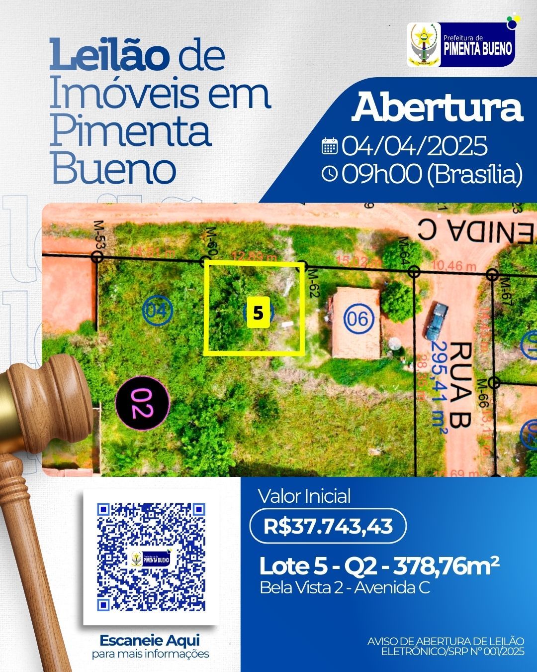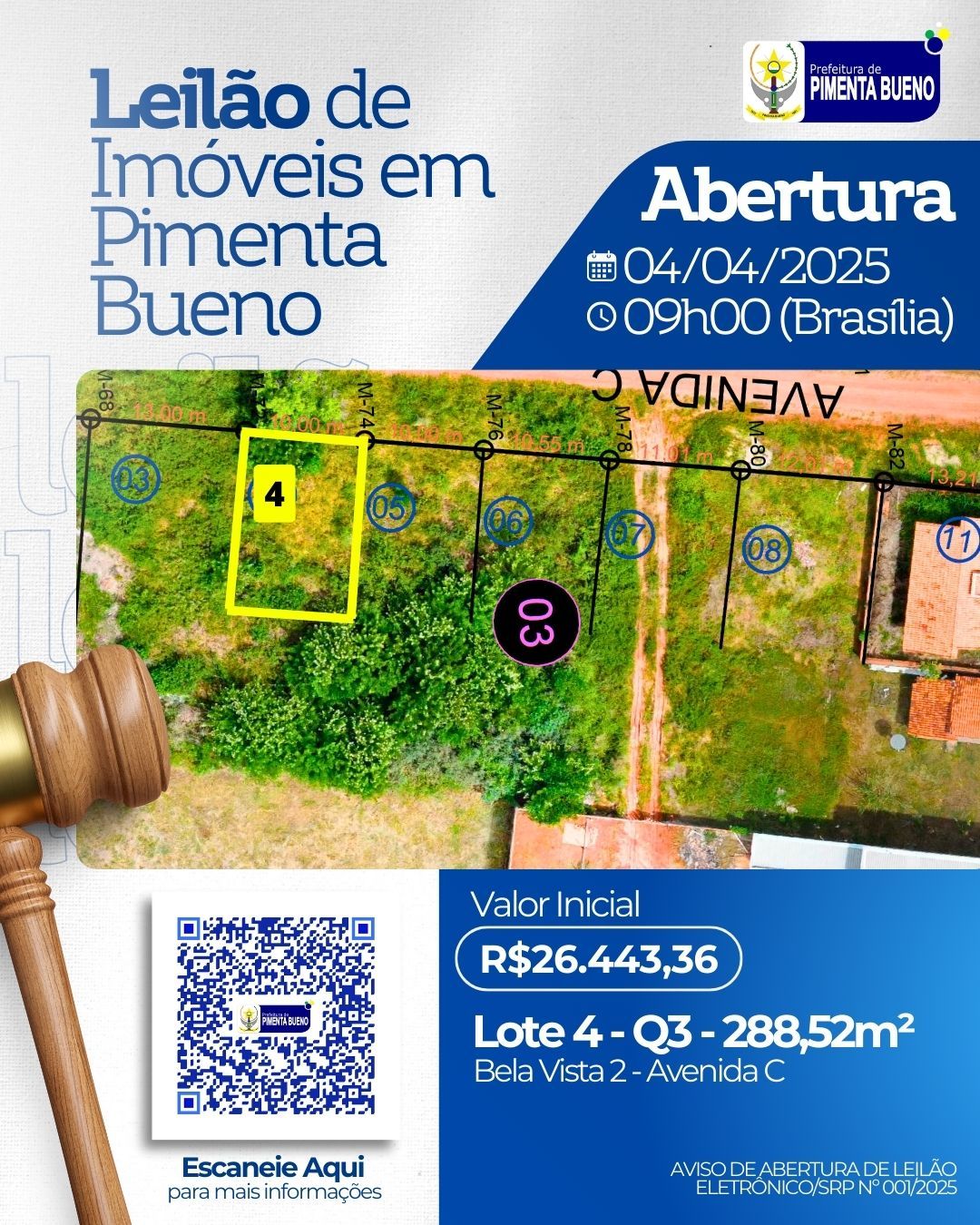 A Prefeitura de Pimenta Bueno torna pública a abertura do Leilão Eletrônico para a alienação de 16 imóveis do patrimônio público municipal. Essa é uma grande oportunidade para quem deseja investir!