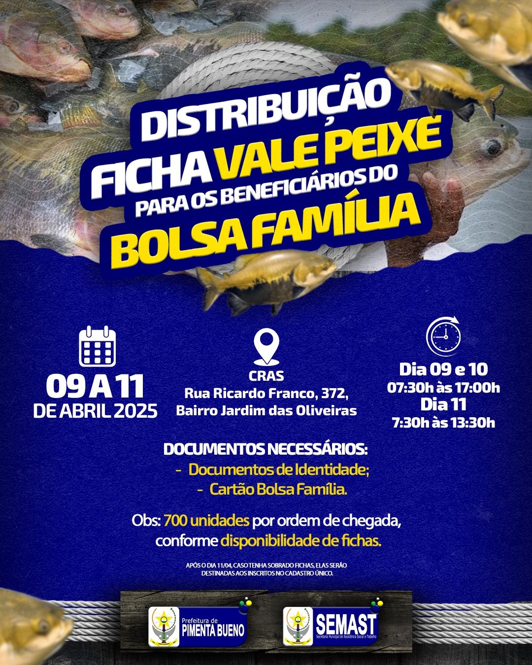 A Prefeitura Municipal de Pimenta Bueno, através da Secretaria Municipal de Assistência Social e Trabalho - SEMAST fará a entrega de Vale Peixe para as famílias beneficiárias do Programa Bolsa Família. Serão disponibilizadas 700 fichas, as quais serão entregues por ordem de chegada.