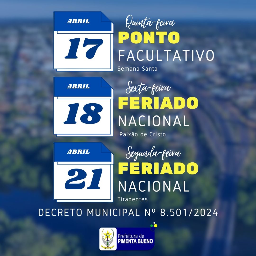 De acordo com o Decreto Municipal nº 8.501/2024 e o Decreto Estadual nº 29.900/2024 , a quinta-feira, 17 de abril, será ponto facultativo em razão da Semana Santa. Já a sexta-feira, 18 de abril, é feriado nacional de Paixão de Cristo . E a segunda-feira, 21 de abril, também será feriado nacional, em comemoração ao Dia de Tiradentes.