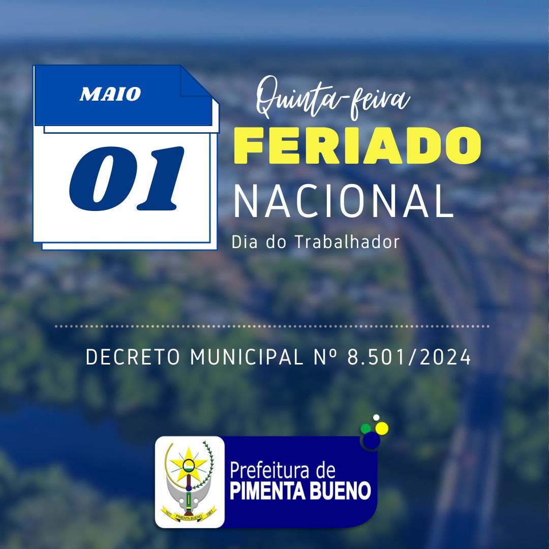 Atenção! No dia 01 de maio de 2025, quinta-feira, os órgãos públicos municipais estarão fechados em razão do Feriado Nacional - Dia do Trabalhador, conforme o Decreto Municipal n.º 8.501/2024.
