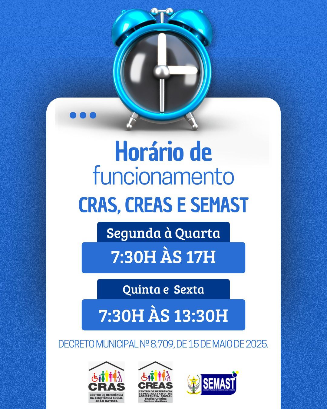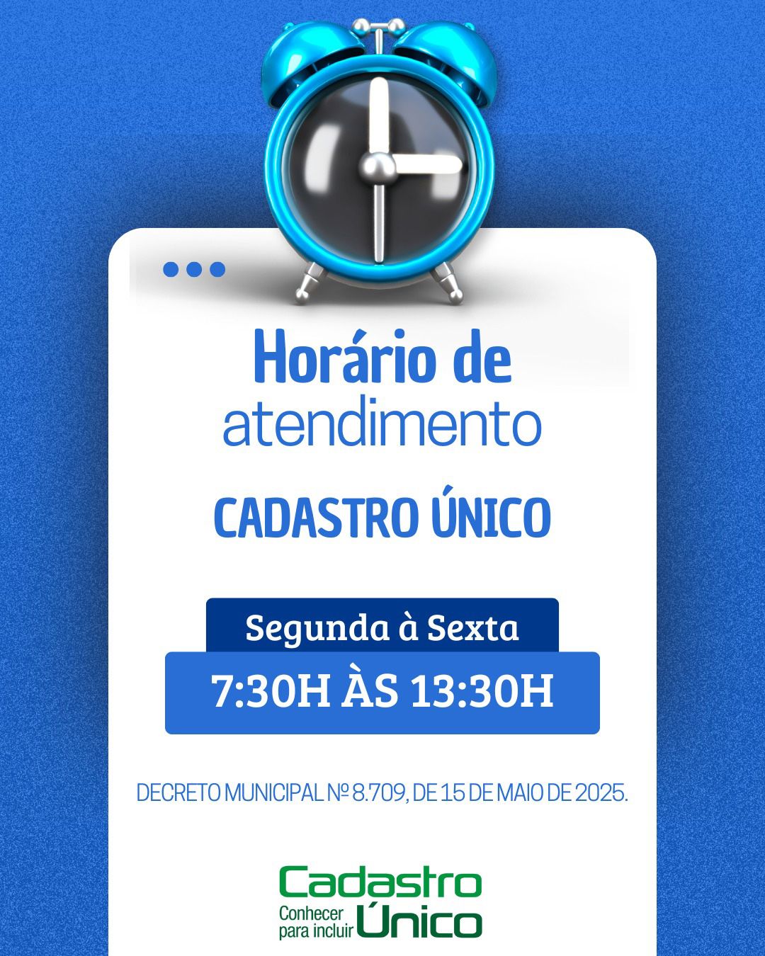 Atenção, população! A partir do Decreto Municipal n.º 8.709, de 15 de maio de 2025, os horários de funcionamento dos nossos serviços foram atualizados: