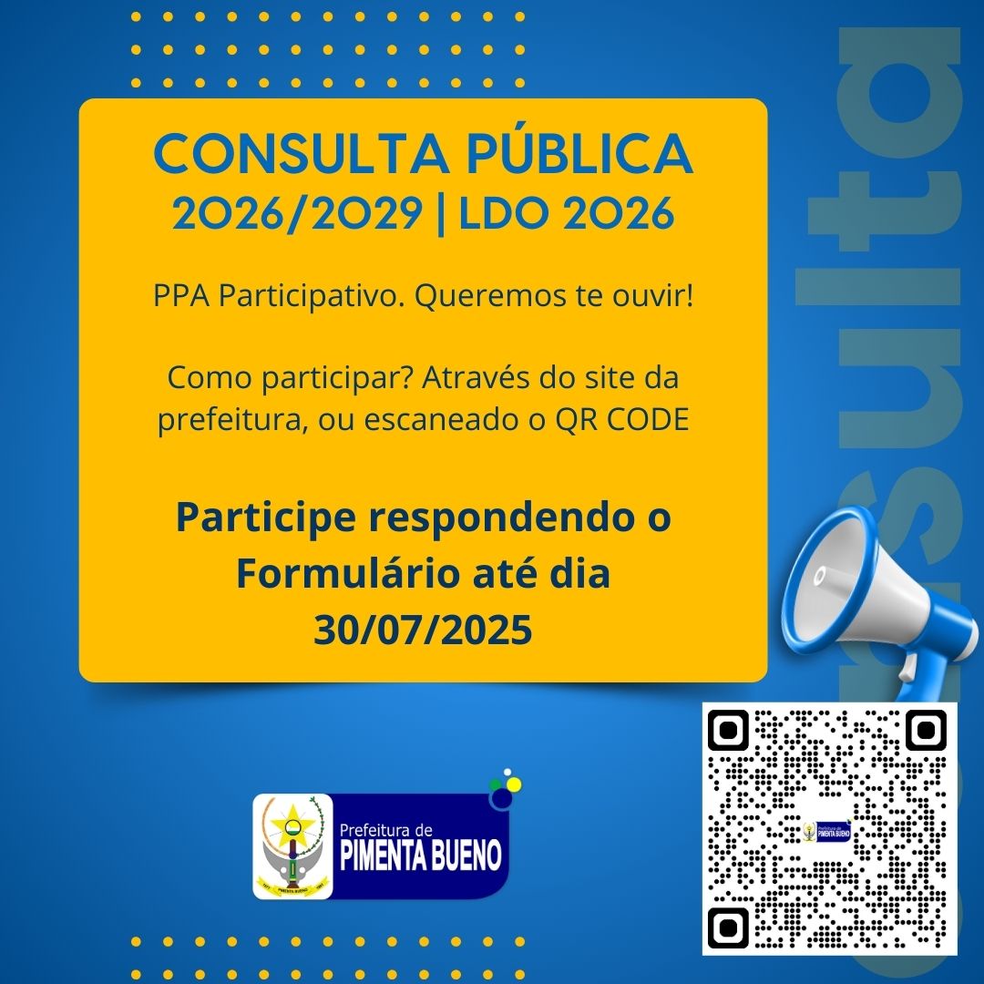 A Prefeitura de Pimenta Bueno está promovendo uma importante Consulta Pública para a elaboração do Plano Plurianual (PPA) 2026-2029 e da Lei de Diretrizes Orçamentárias (LDO) 2026. A participação da população é fundamental nesse processo, que visa planejar as prioridades e investimentos para os próximos quatro anos no município.