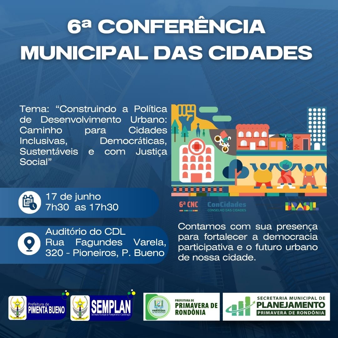 A Prefeitura de Pimenta Bueno, por meio da Secretaria Municipal de Planejamento, Gestão e Coordenação Geral e a Prefeitura Municipal de Primavera de Rondônia, realizarão a 6ª Conferência Municipal das Cidades com o Tema: “Construindo a Política de Desenvolvimento Urbano: Caminho para Cidades Inclusivas, Democráticas, Sustentáveis e com Justiça Social”