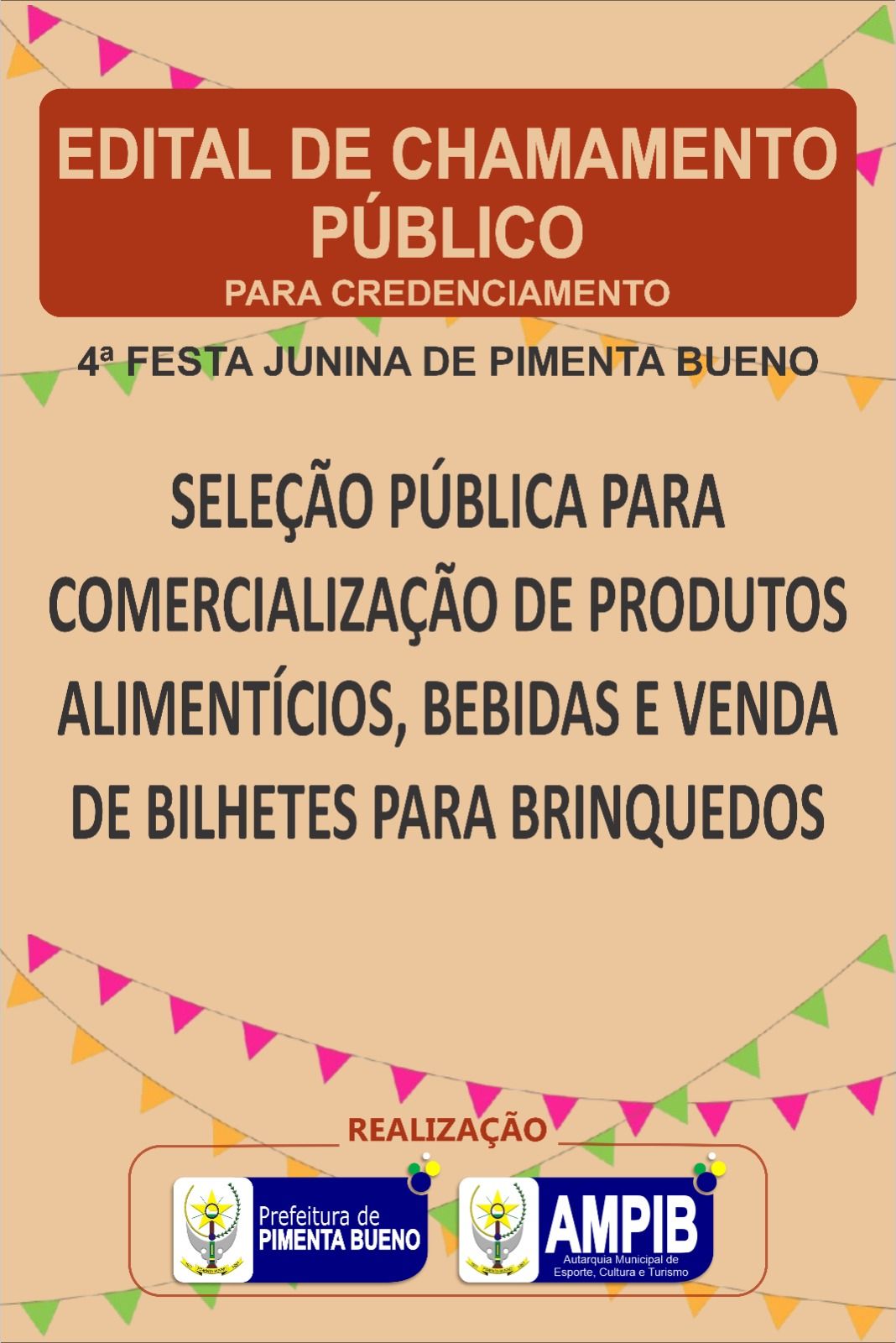 A Prefeitura de Pimenta Bueno e a AMPIB (Autarquia Municipal de Esporte, Cultura e Turismo), publica o Edital de Chamamento Público para o credenciamento de interessados em participar da 4ª edição da tradicional Festa Junina do município.