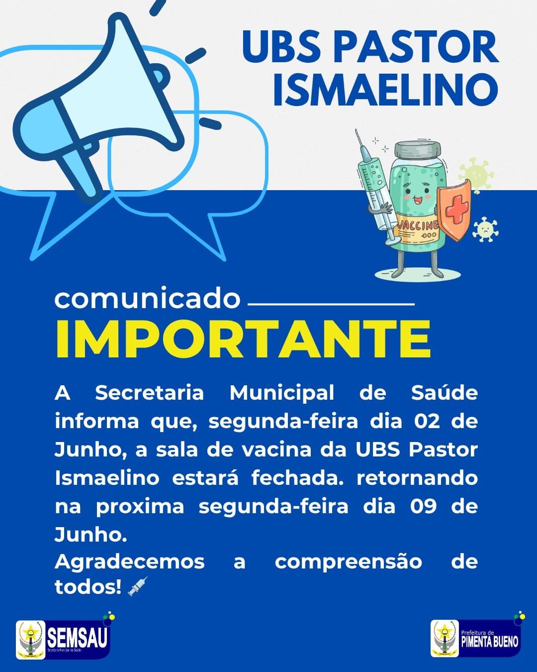 dia 02 de junho, a sala de vacina da UBS Pastor Ismaelino estará fechada.