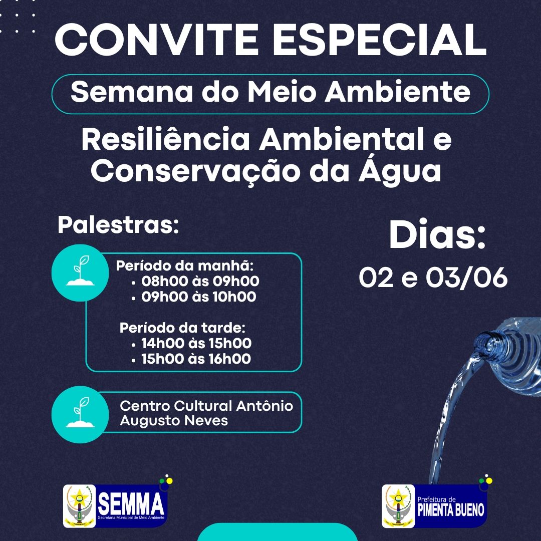 Nos dias 2 e 3 de junho, a Secretaria Municipal de Meio Ambiente (SEMMA) e a Prefeitura de Pimenta Bueno realizam, no Centro Cultural Antônio Augusto Neves, um evento voltado à educação ambiental, com foco na preservação da água e na construção de uma consciência ecológica.