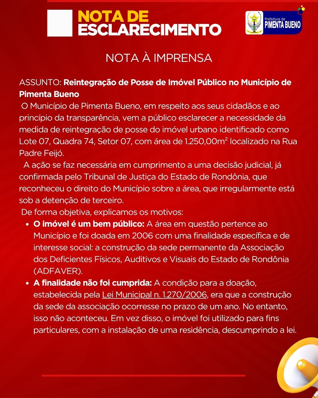 O Município de Pimenta Bueno, em respeito aos seus cidadãos e ao princípio da transparência, vem a público esclarecer a necessidade da medida de reintegração de posse do imóvel urbano identificado como Lote 07, Quadra 74, Setor 07, com área de 1.250,00m² localizado na Rua Padre Feijó.