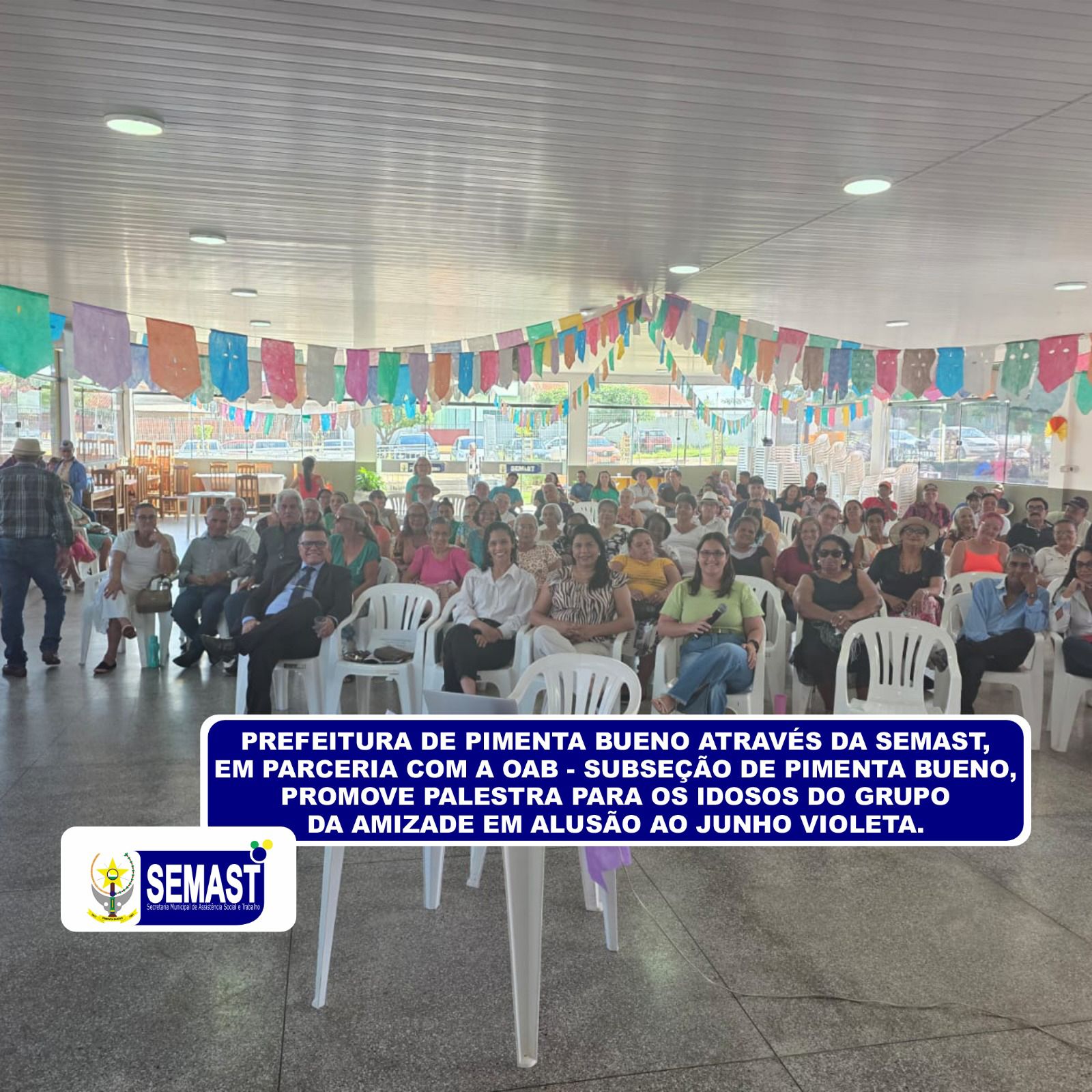 A Secretaria Municipal de Assistência Social e Trabalho (SEMAST), em parceria com a Ordem dos Advogados do Brasil, realizou nesta terça-feira, 17 de junho, uma palestra para os idosos participantes do Serviço de Convivência e Fortalecimento de Vínculos (SCFV), no Centro de Convivência da Terceira Idade. A ação foi promovida em alusão ao Junho Violeta, mês dedicado à conscientização e ao combate à violência contra a pessoa idosa.