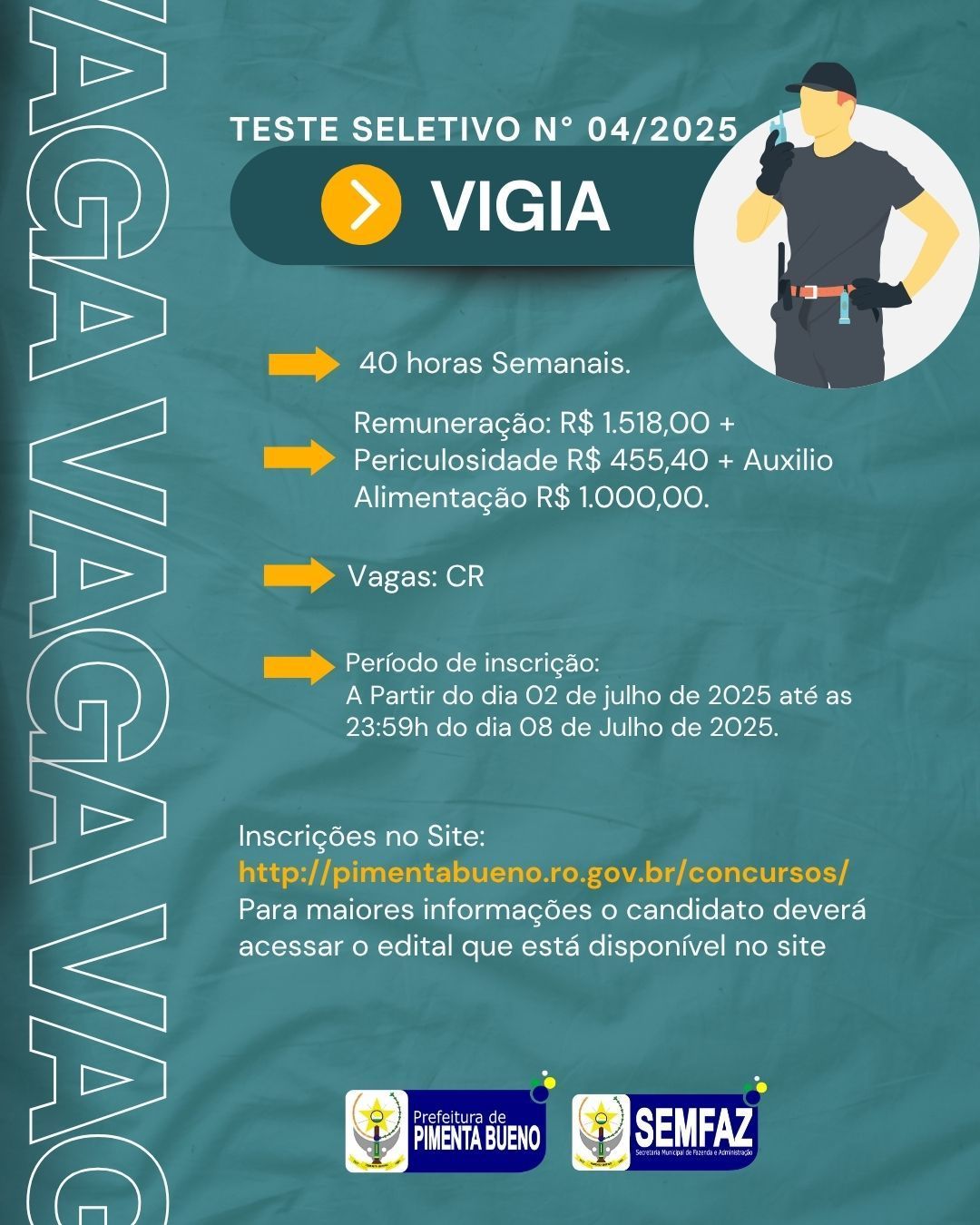 A Prefeitura de Pimenta Bueno, por meio da Secretaria Municipal de Fazenda e Administração Geral, informa que estão abertas as inscrições para o Teste Seletivo Simplificado nº 04/2025, destinado à contratação temporária de servidores para o cargo de Vigia.