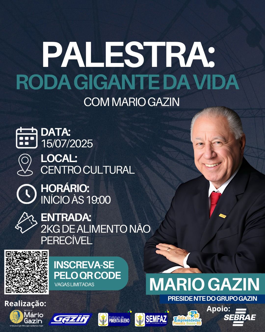 O renomado empresário Mario Gazin, presidente do Grupo Gazin, estará em Pimenta Bueno no próximo dia 15 de julho de 2025, para ministrar a palestra motivacional “Roda Gigante da Vida”. O evento será realizado no Centro Cultural, com início às 19h, e promete reunir um grande público interessado em empreendedorismo, superação e desenvolvimento pessoal.
