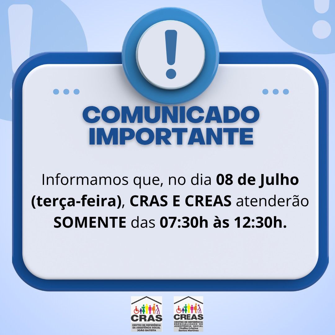 08/07 (terça-feira): atendimento no CRAS e CREAS das 07h30 às 12h30.
