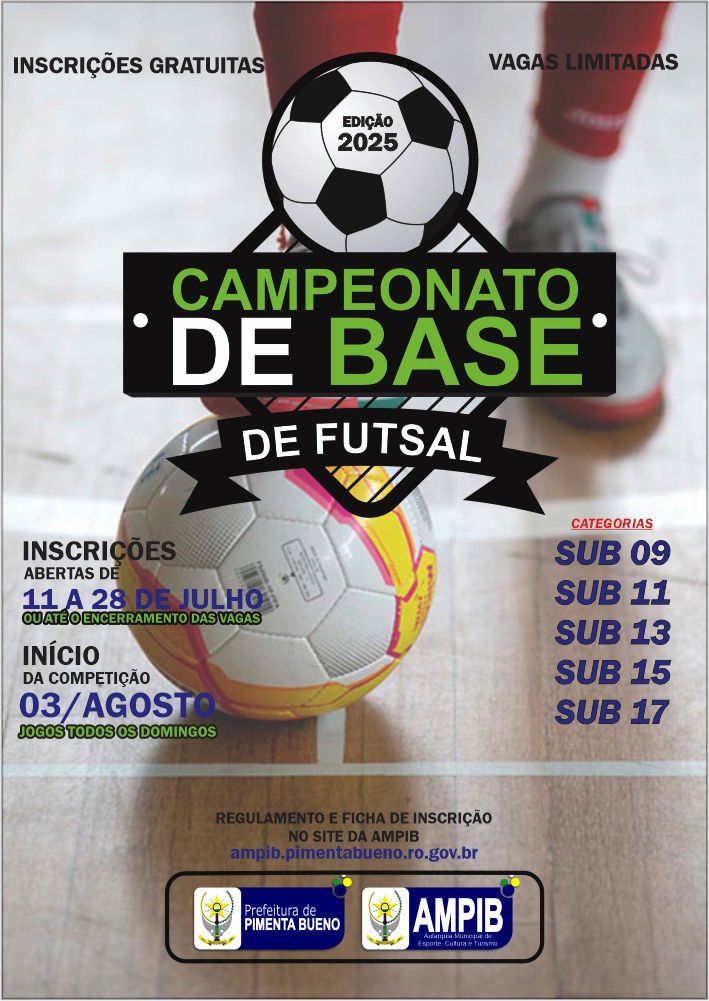 A Prefeitura de Pimenta Bueno, por meio da AMPIB (Autarquia Municipal de Esporte, Cultura e Turismo), está com as inscrições abertas para o Campeonato de Base de Futsal – Edição 2025. A competição, voltada para jovens atletas, promete movimentar os domingos do município com partidas emocionantes e grande participação da comunidade.