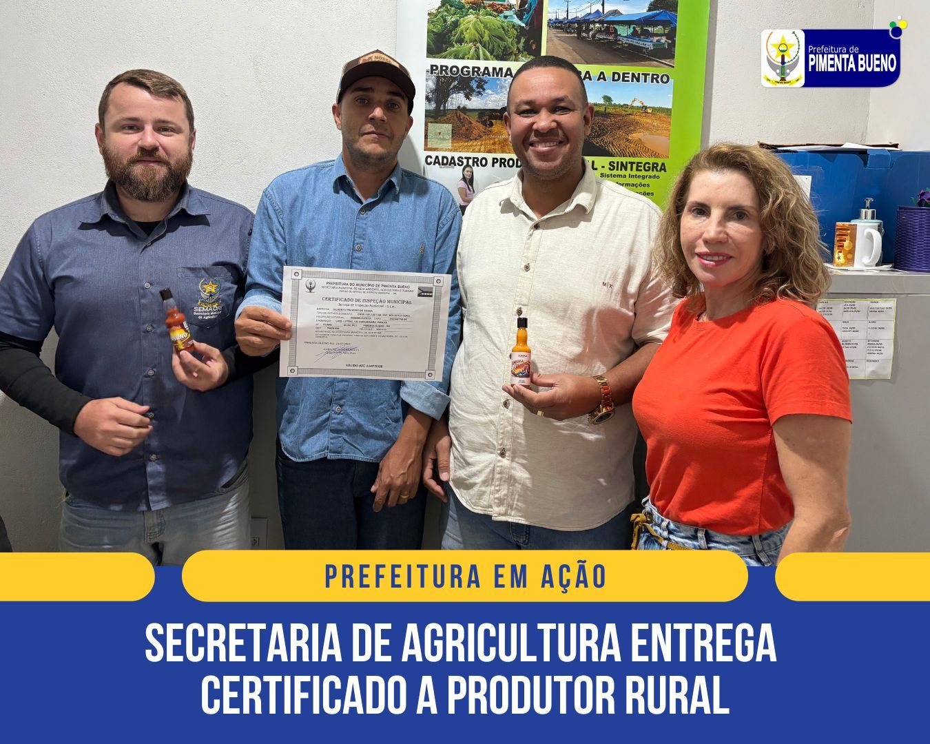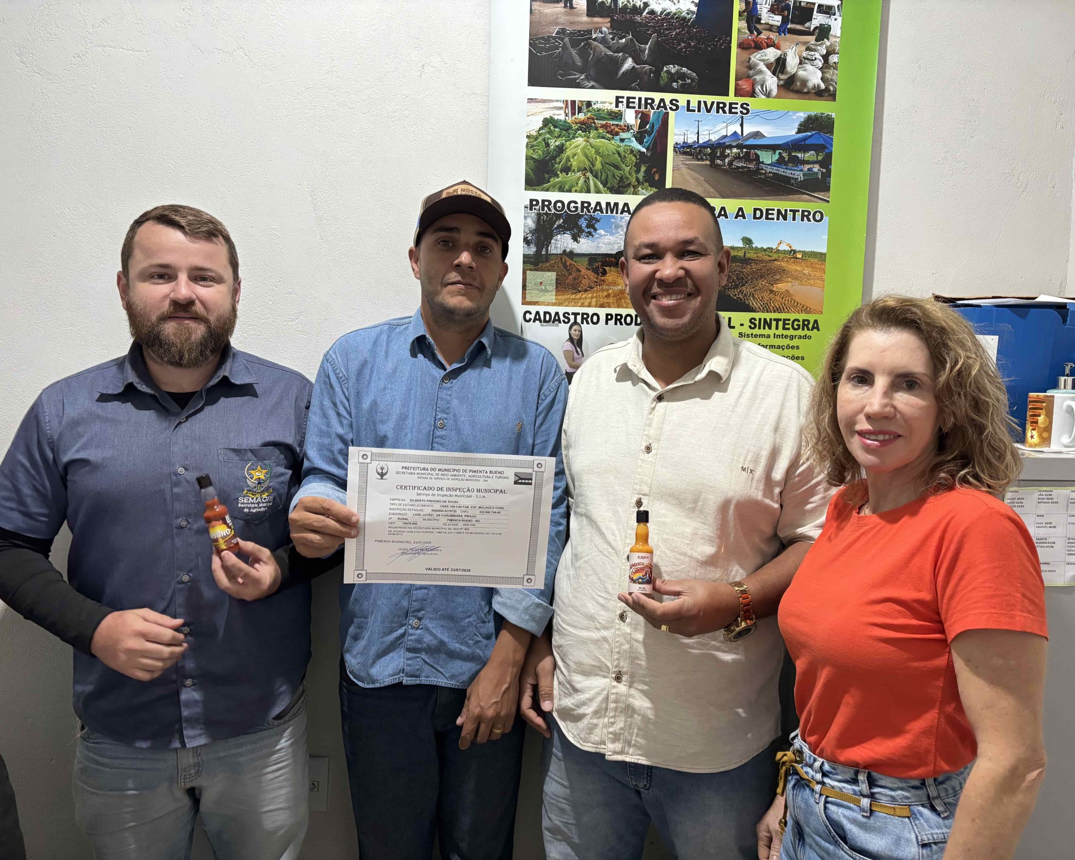 Nesta quarta-feira, 23 de julho, a Secretaria Municipal de Agricultura (SEMAGRI) realizou a entrega do Certificado de Inspeção SIM ao produtor Gilberto Pinheiro de Souza, proprietário da Pimenta na Roça, CNAE 109-3-00 Fabricação de Especiarias, Molhos e Condimentos, Setor LH35, Lote 07, GB Corumbiara, Pirajui. O documento atesta a segurança e a qualidade higiênica e sanitária dos produtos comercializados.