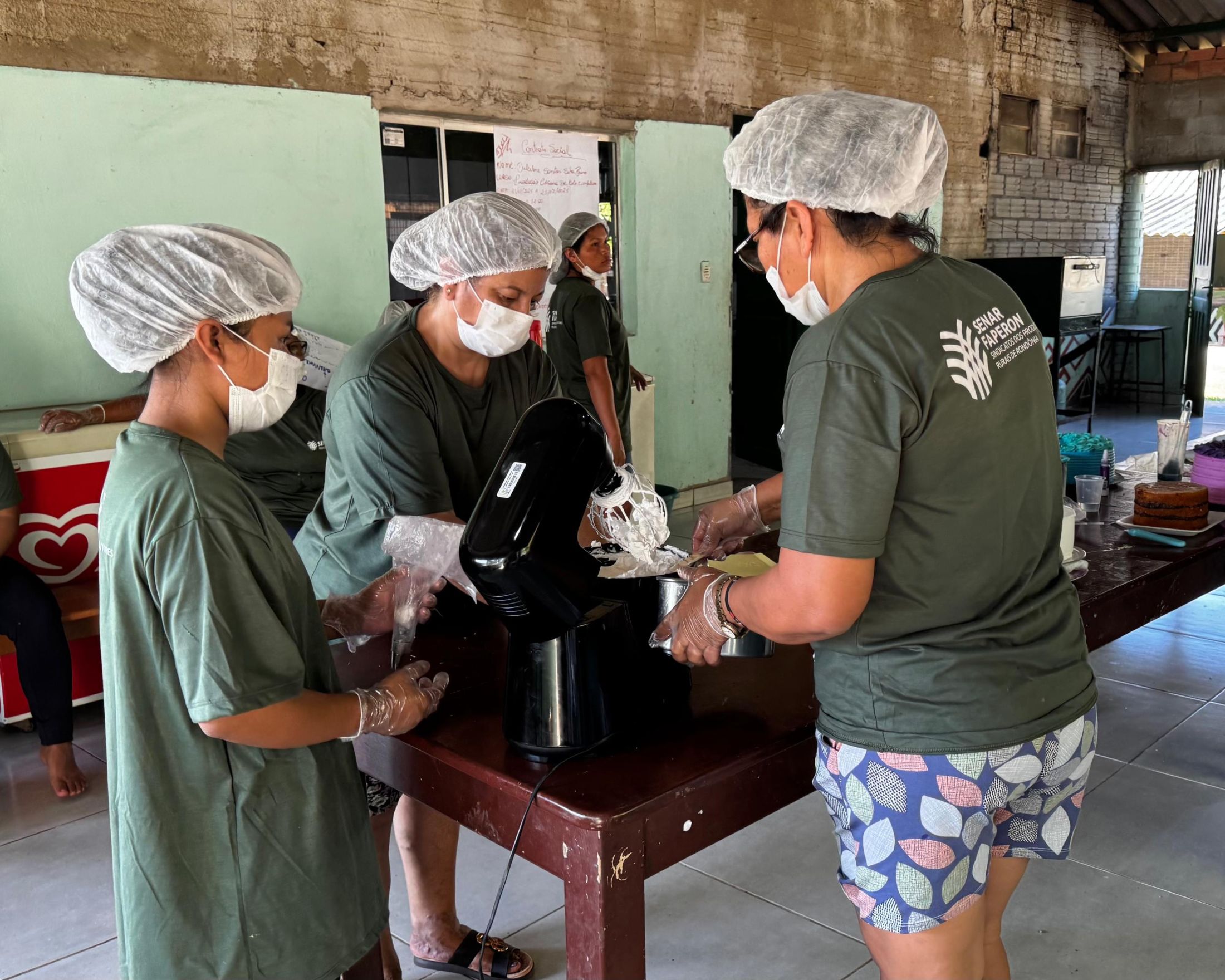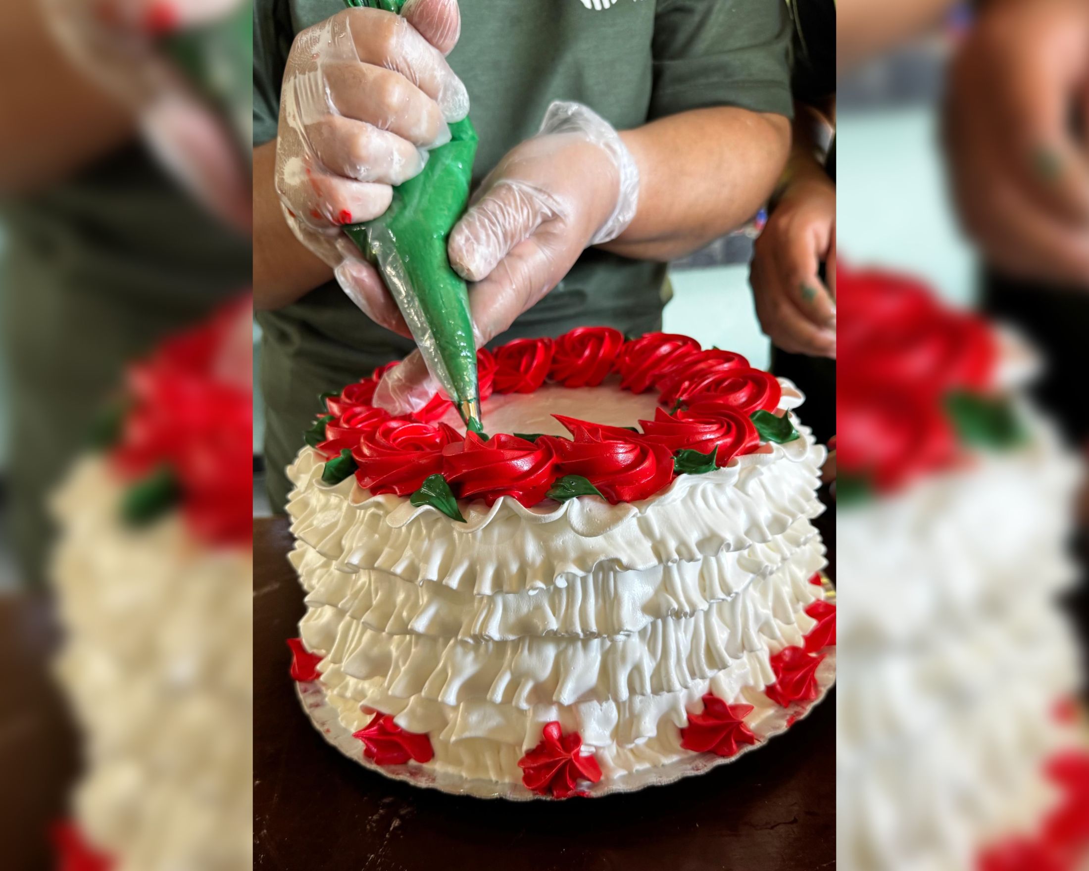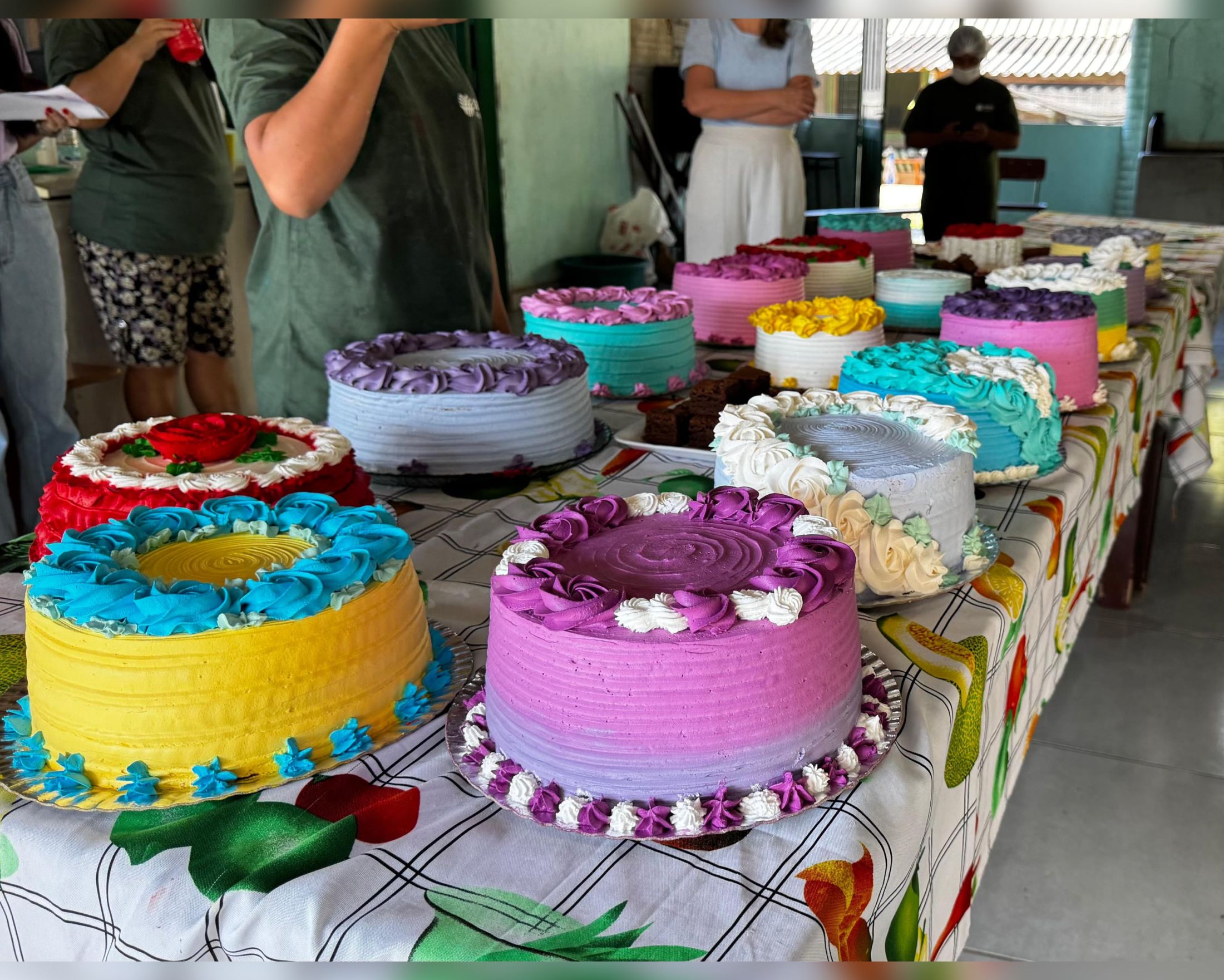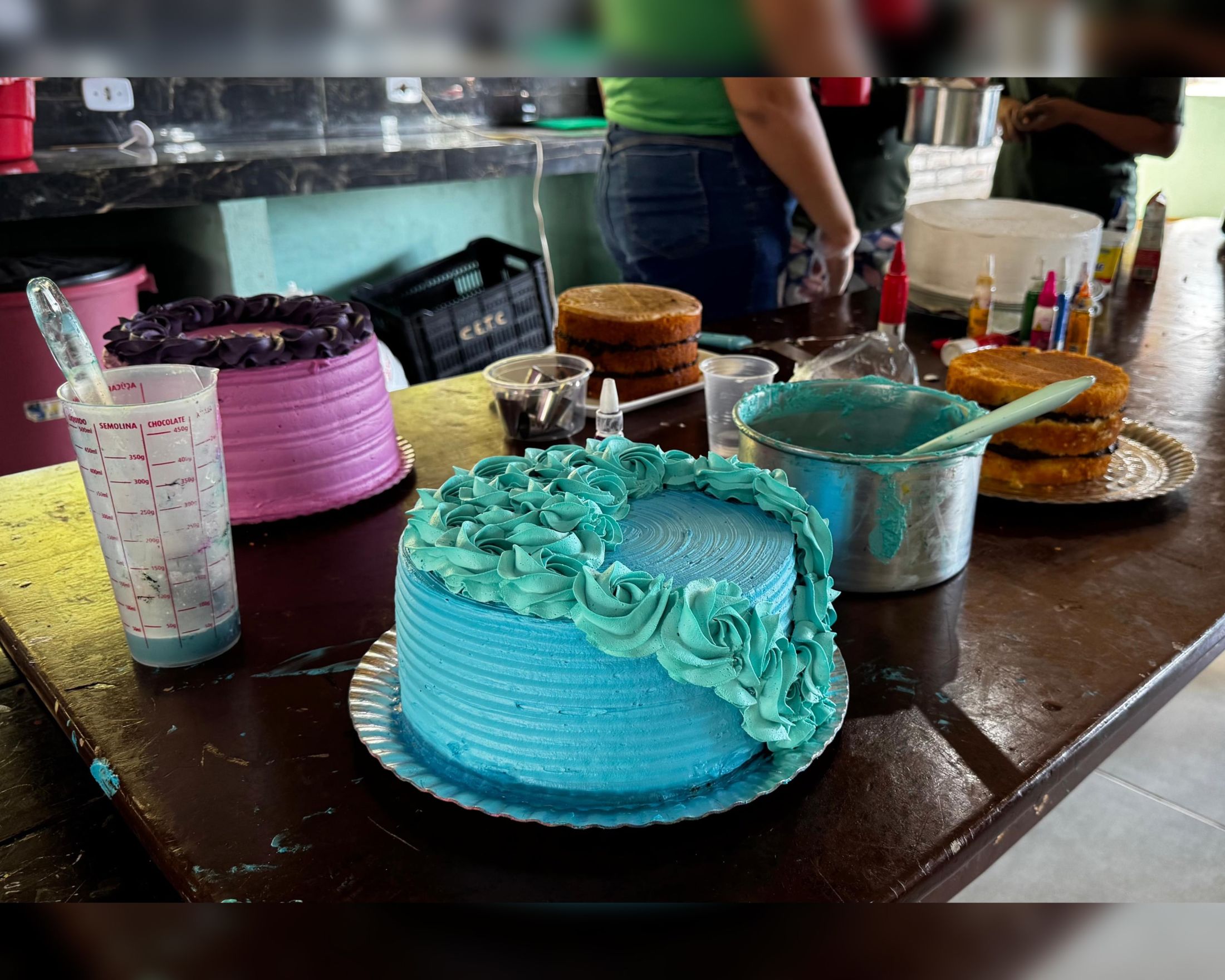 Durante a formação, os participantes aprenderam técnicas de preparo de massas, recheios e finalizações com decorações variadas, aprimorando conhecimentos para aplicação prática na produção de bolos caseiros.