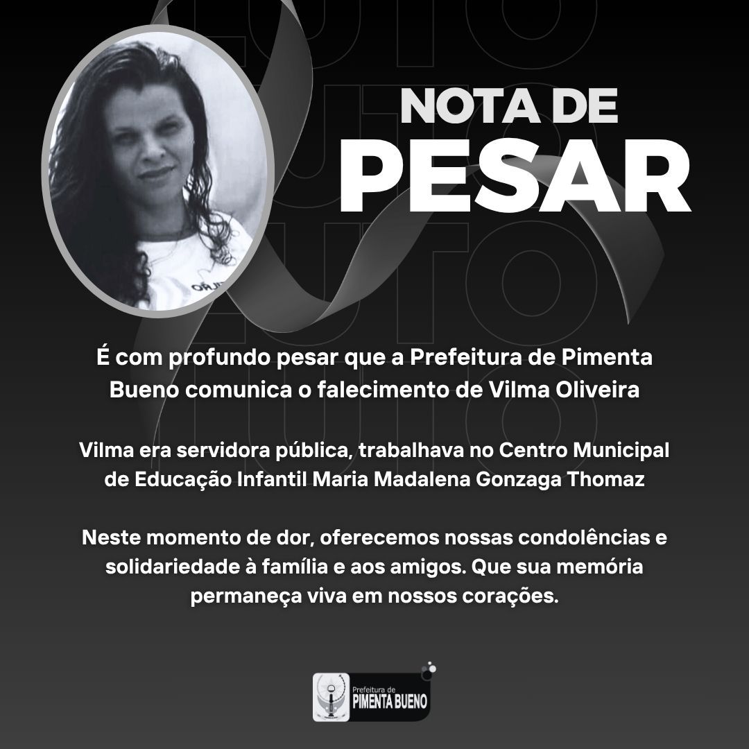 A Prefeitura de Pimenta Bueno manifesta profundo pesar pelo falecimento de Vilma Oliveira, servidora pública lotada no Centro Municipal de Educação Infantil Maria Madalena Gonzaga Thomaz.