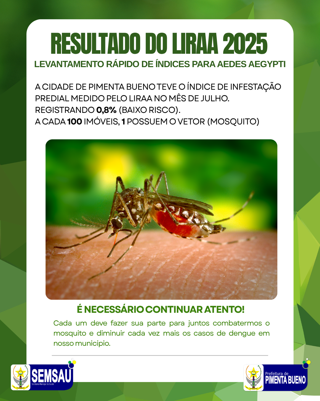 A CIDADE DE PIMENTA BUENO TEVE O ÍNDICE DE INFESTAÇÃO PREDIAL MEDIDO PELO LIRAa NO MÊS DE JULHO.