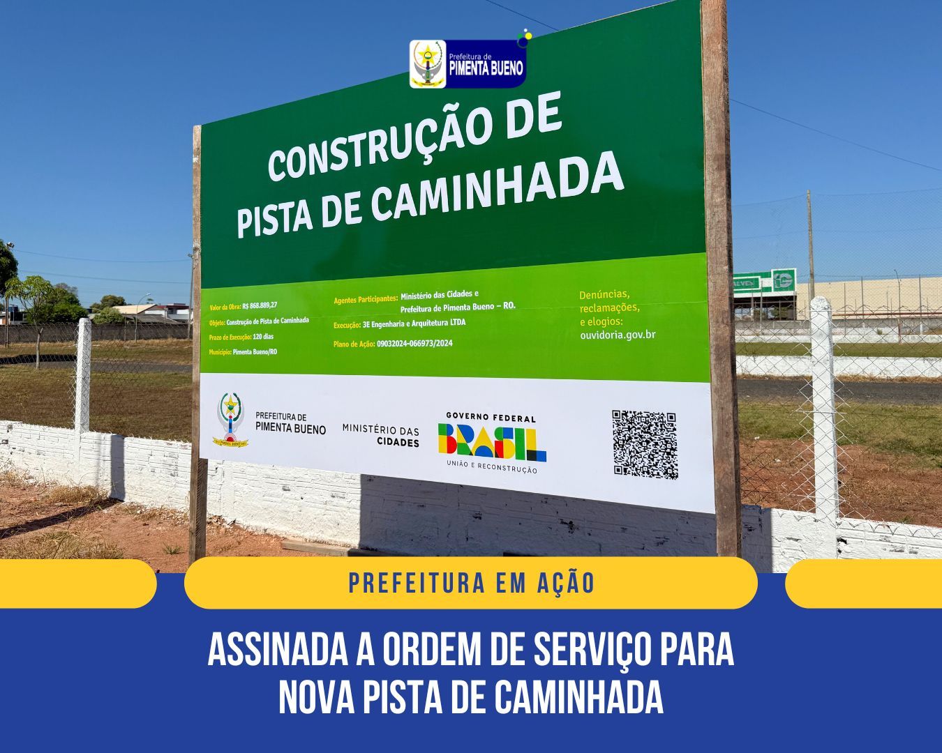 A Prefeitura assinou a ordem de serviço para a construção de uma nova pista de caminhada, que será um espaço voltado à promoção da saúde, bem-estar e lazer da população. O projeto contempla um percurso seguro, integrado ao meio ambiente e com acessibilidade, incentivando a prática de exercícios e o convívio familiar ao ar livre. O investimento total destinado à obra é de R$ 1.000.000,00, oriundos de emenda parlamentar do Deputado Federal Thiago Flores.