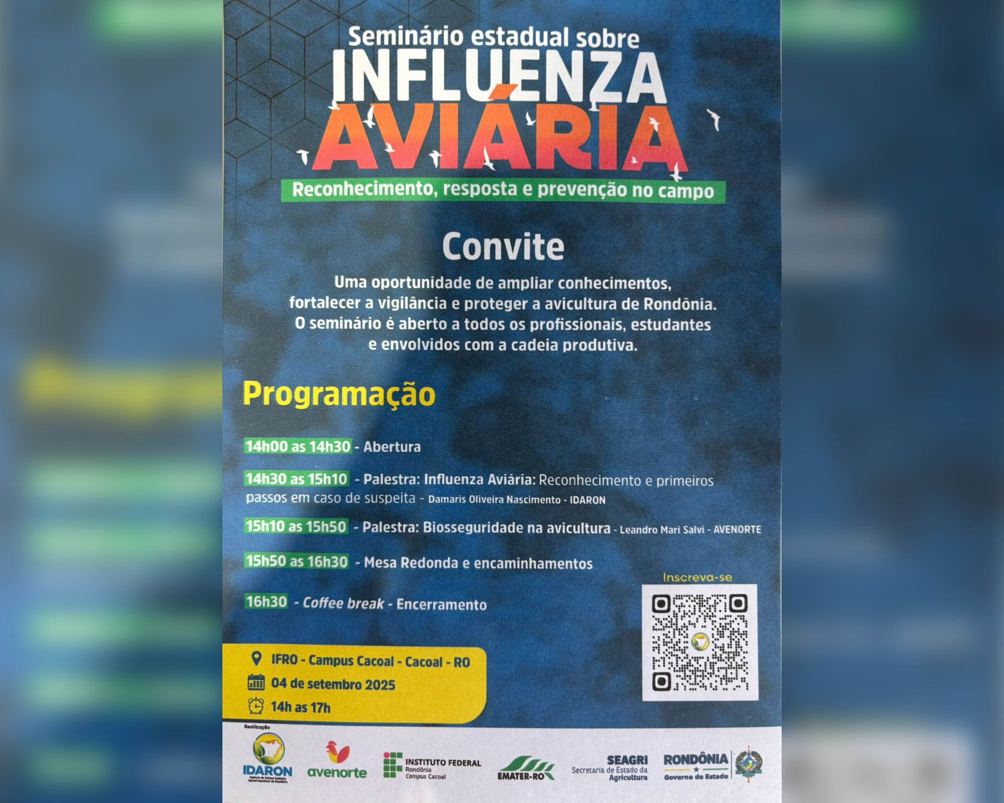 O evento será realizado no dia 4 de setembro de 2025, das 14h às 17h, no Instituto Federal de Rondônia (IFRO) – Campus Cacoal, em Cacoal. A programação tem como objetivo ampliar o conhecimento sobre a doença, promover a troca de experiências e reforçar as medidas de prevenção para proteger a avicultura regional.