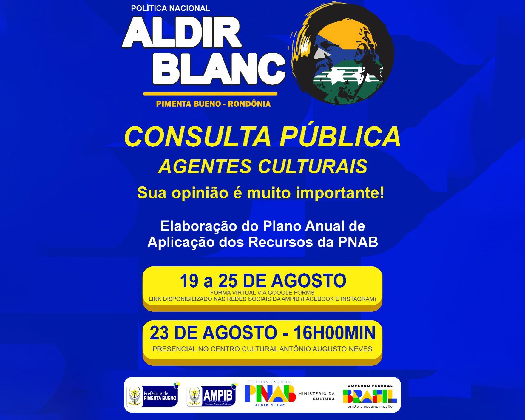 A Prefeitura de Pimenta Bueno, por meio da Autarquia Municipal de Esporte, Cultura e Turismo (AMPIB), abriu consulta pública para a construção do Plano de Aplicação dos Recursos da Política Nacional Aldir Blanc (PNAB). O objetivo é garantir a participação da sociedade na definição das prioridades que orientarão a destinação dos investimentos culturais no município.