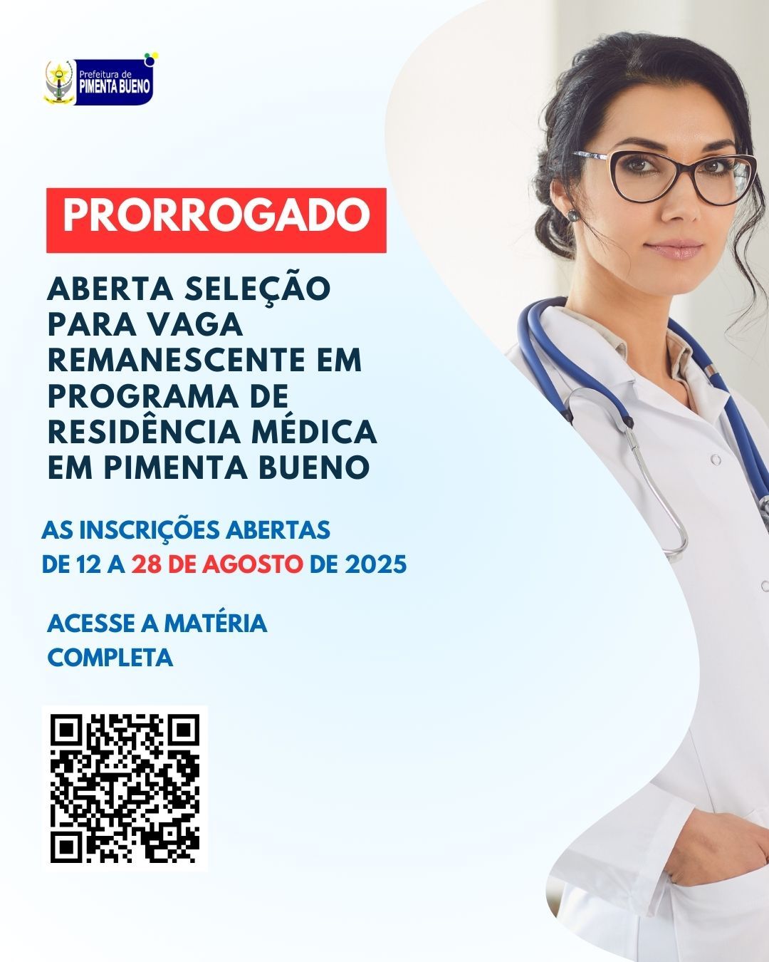 A Prefeitura de Pimenta Bueno, por meio da SEMSAU, informa que foi prorrogado o prazo de inscrições para a seleção de vaga remanescente do Programa de Residência Médica em Medicina de Família e Comunidade.