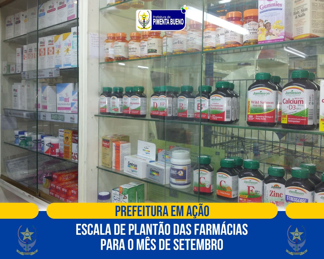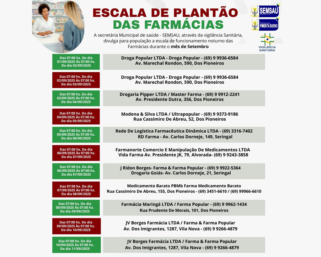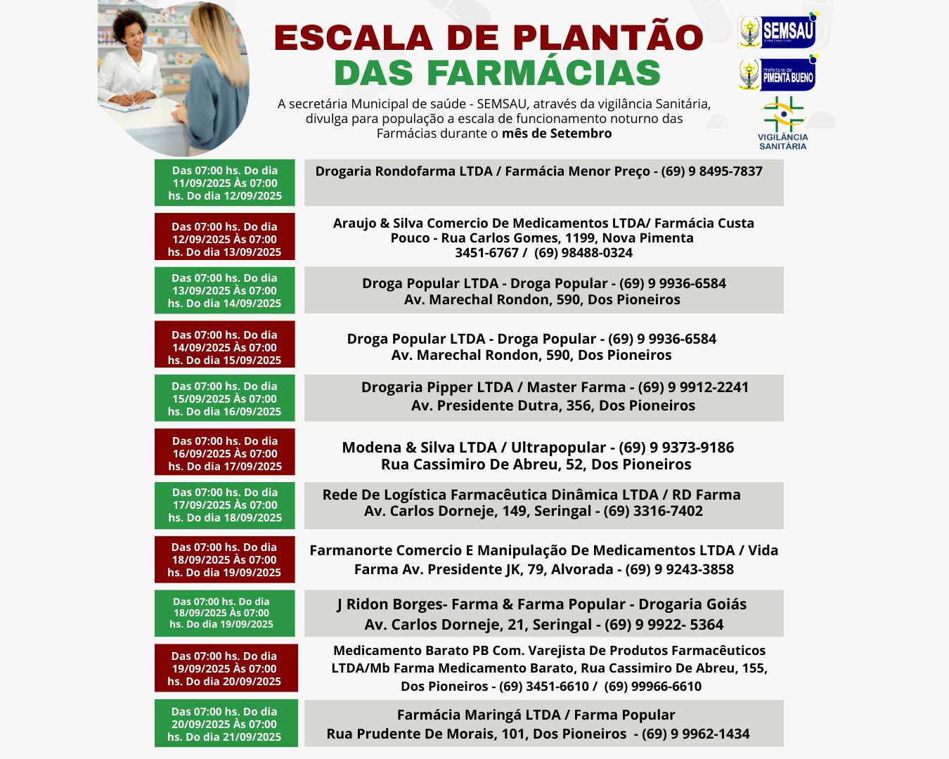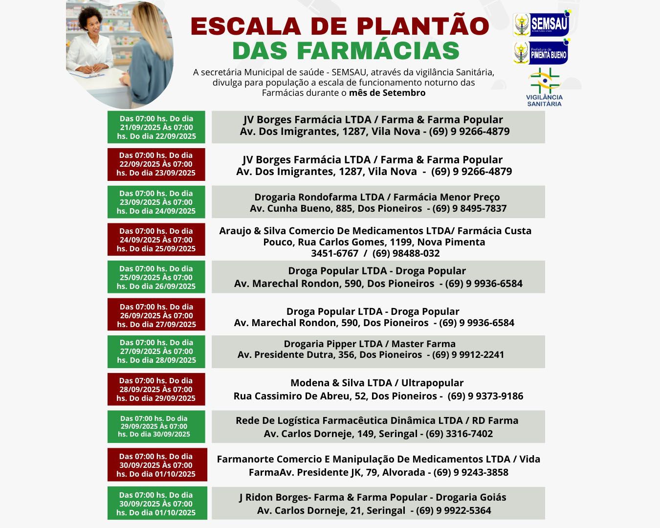 A Prefeitura de Pimenta Bueno, por meio da Secretaria Municipal de Saúde (SEMSAU) e da Vigilância Sanitária, informa à população a escala de funcionamento noturno das farmácias no município durante o mês de setembro de 2025.