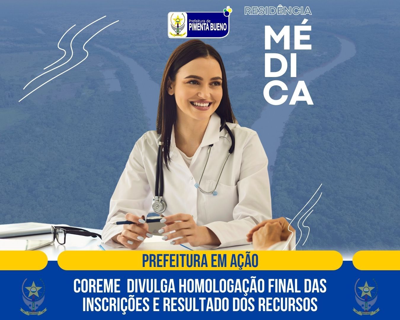 A Comissão de Residência Médica (COREME) de Pimenta Bueno publicou a homologação final das inscrições do Edital COREME nº 01/2025, referente ao processo seletivo das vagas remanescentes do Programa de Residência Médica em Medicina de Família e Comunidade, com início em setembro de 2025.