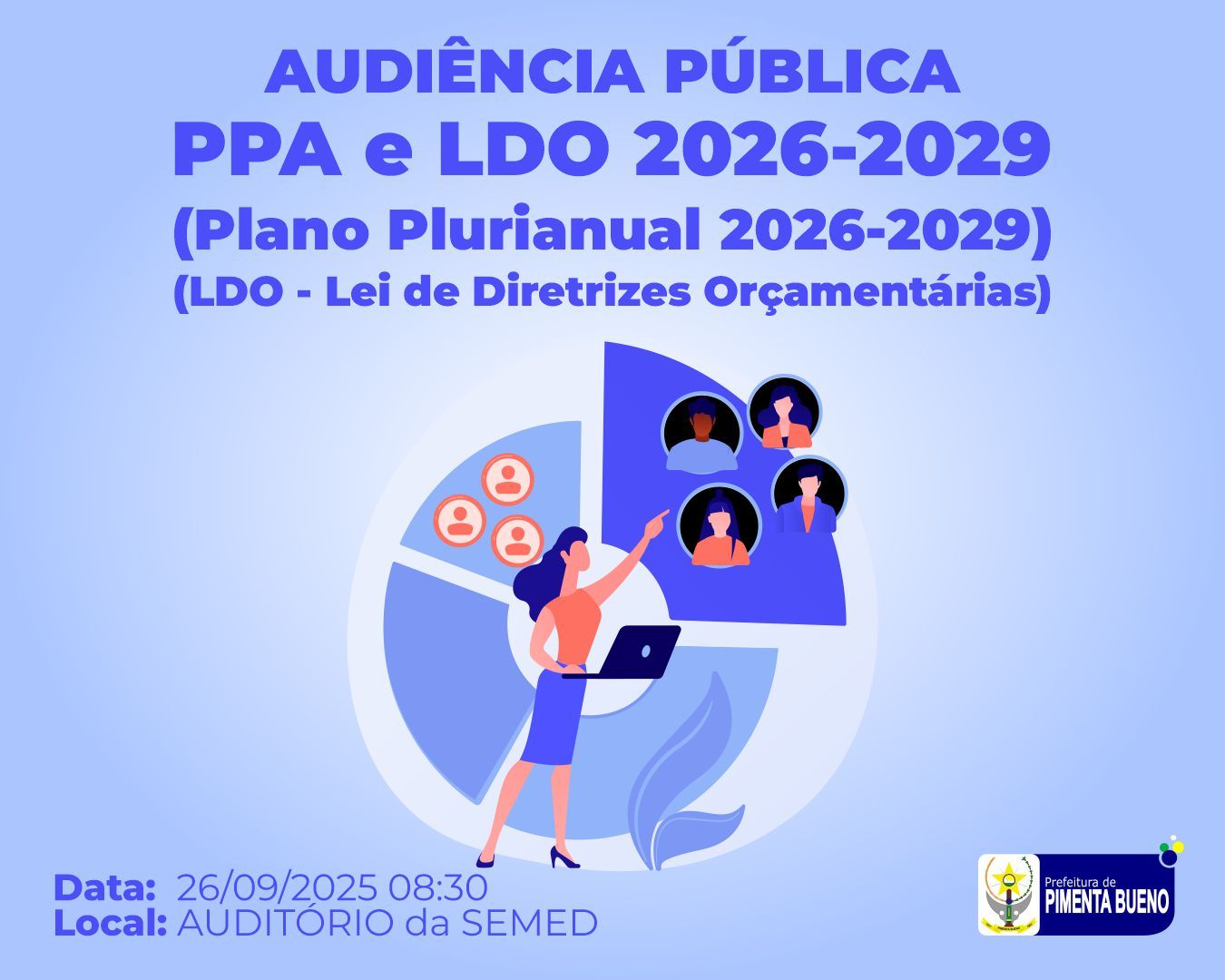 A prefeitura Municipal de Pimenta Bueno, convoca a população em geral para a audiência pública, tendo como pauta: apresentação do plano plurianual 2026-2029 (PPA) e a lei de diretrizes orçamentárias - 2026 (LDO).