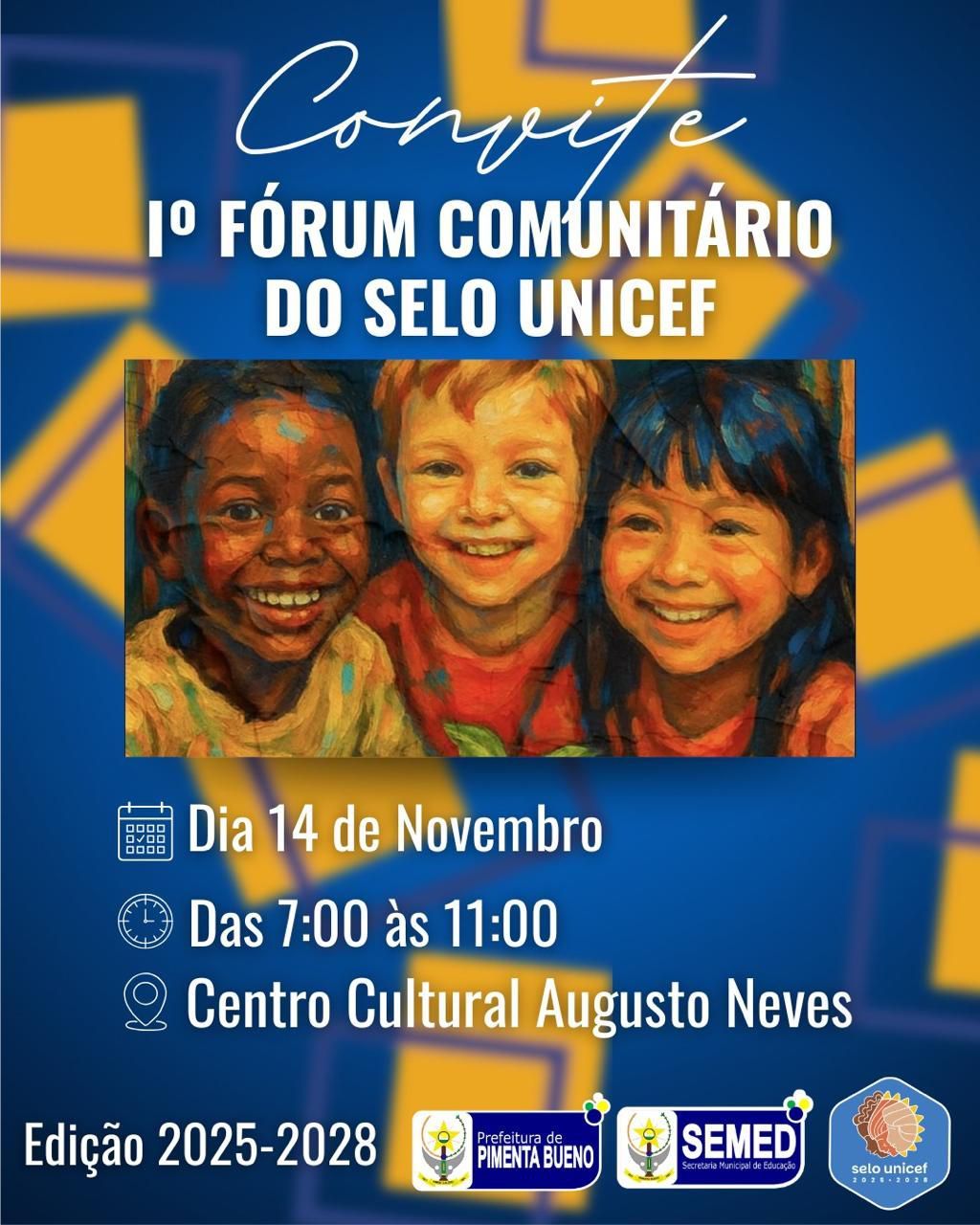 A Prefeitura de Pimenta Bueno convida toda a comunidade para o I Fórum Comunitário do Selo UNICEF (Ciclo 2025-2028).
