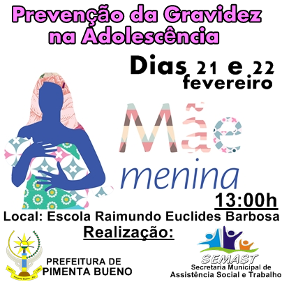 A Prefeitura de Pimenta Bueno, por meio da Secretaria Municipal de Assistência Social e Trabalho (SEMAST), realizará nos dias 21 e 22 de fevereiro um projeto de Prevenção da Gravidez na Adolescência, na Escola Estadual de Ensino Fundamental e Médio Raimundo Euclides Barbosa às 13h00h.