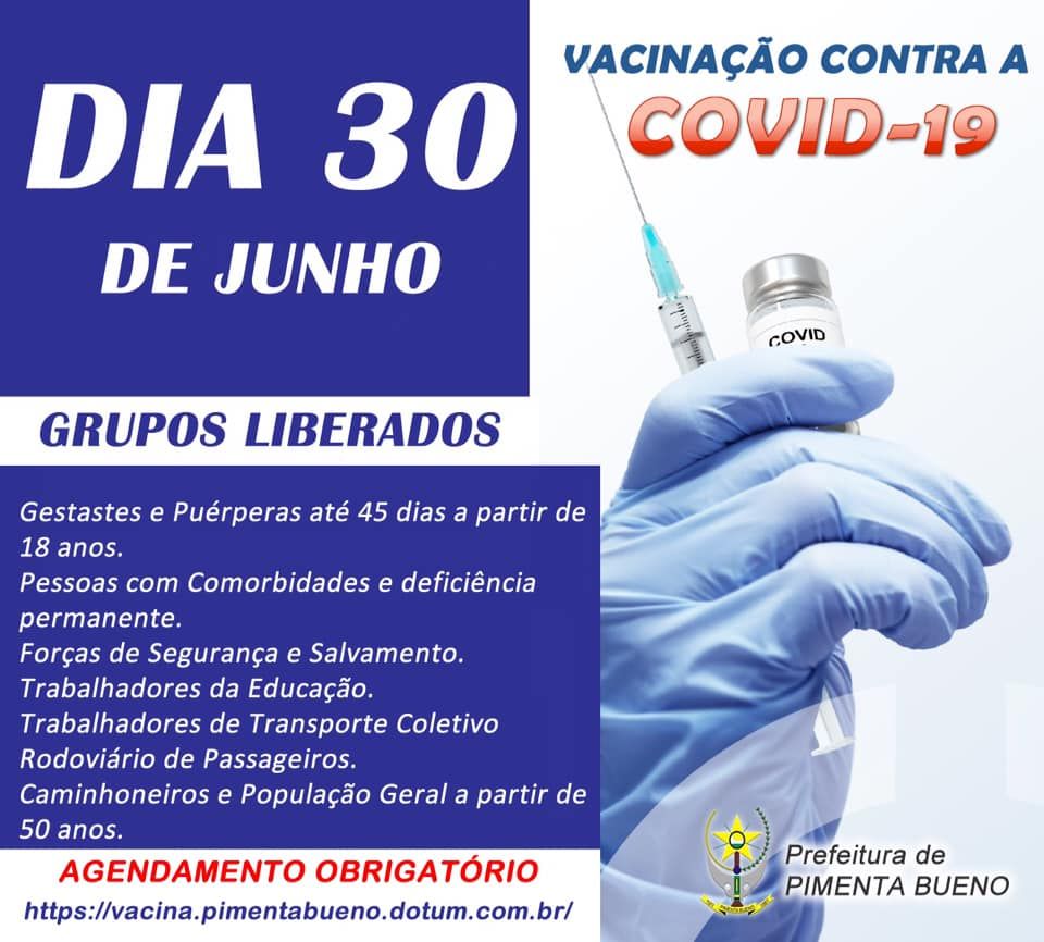 GRUPOS LIBERADOS Gestantes e Puérperas até 45 dias a partir de 18 anos Pessoas com Comorbidades e deficiência Permanente; Forças de Segurança e Salvamento; Trabalhadores da Educação; Trabalhadores de Transporte Coletivo Rodoviário de Passageiros; Caminhoneiros e População Geral a partir de 50 anos. AGENDAMENTO OBRIGATÓRIO PELO LINK: https://vacina.pimentabueno.dotum.com.br/