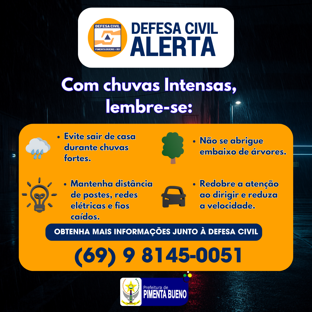 O Instituto Nacional de Meteorologia (INMET) emitiu, na manhã desta sexta-feira (05), um alerta de perigo para chuvas intensas, que inclui o município de Pimenta Bueno. O aviso teve início às 09h de hoje e segue válido até às 09h deste sábado (06).