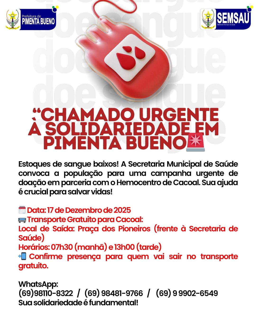 Estoques de sangue baixos! A Secretaria Municipal de Saúde convoca a população para uma campanha urgente de doação em parceria com o Hemocentro de Cacoal. Sua ajuda é crucial para salvar vidas!