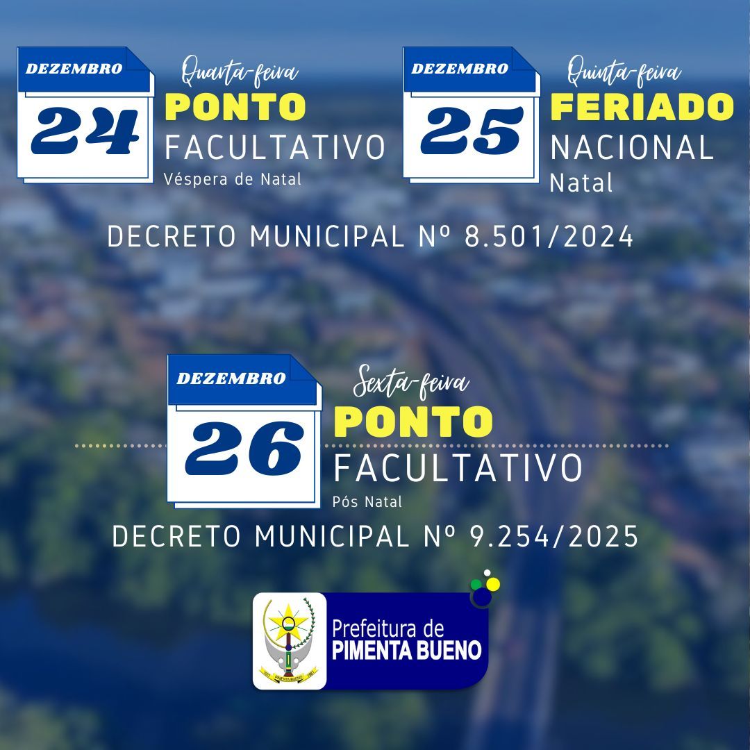A Prefeitura Municipal de Pimenta Bueno informa à população o calendário de feriado e pontos facultativos referentes ao período de Natal, conforme decretos municipais vigentes.
